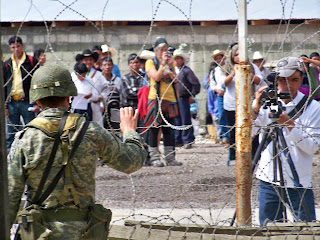 Les femmes ont donc envahit le camp militaire durant près d'une heure, en criant et lisant leur communiqué antimilitariste. Les soldats s'armèrent et s'équipèrent, entrant dans leur camion, armes en main. Mais tant de femmes pacifistes et déterminées criant contre eux, la présence de journalistes et d'internationaux les ont laissé sur le carreau sans pouvoir agir.