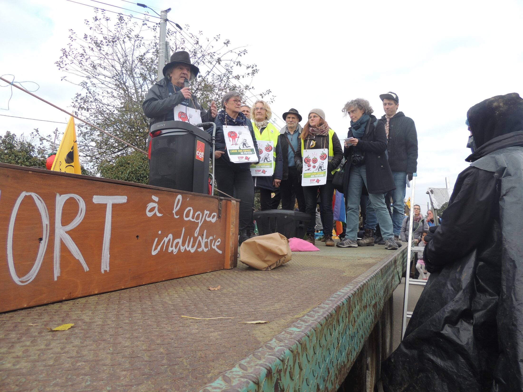 Au lieudit « Le Bois Aubé » différentes interventions ont eu lieu avec celle non dénuée d’humour du PDG peut être celui d’agriCore, recevant les huées des participants, invitant à contempler son oeuvre déjà réalisée
