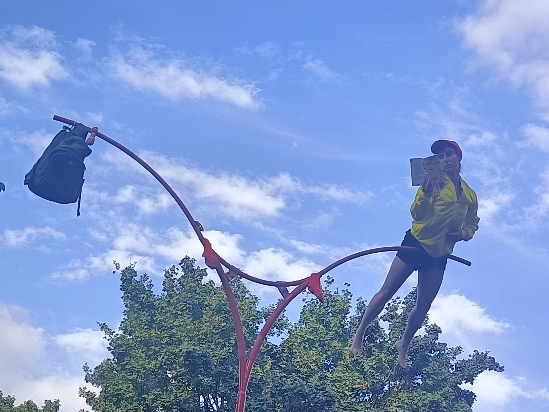 L’acrobate déplie d’abord une notice qu’elle se met à lire, puis elle se met doucement et très méthodiquement à assembler et à donner forme à une haute structure en arabesque d’un ton rouge profond. Puis elle se lie rapidement avec le public, mais pas d’une façon habituelle.