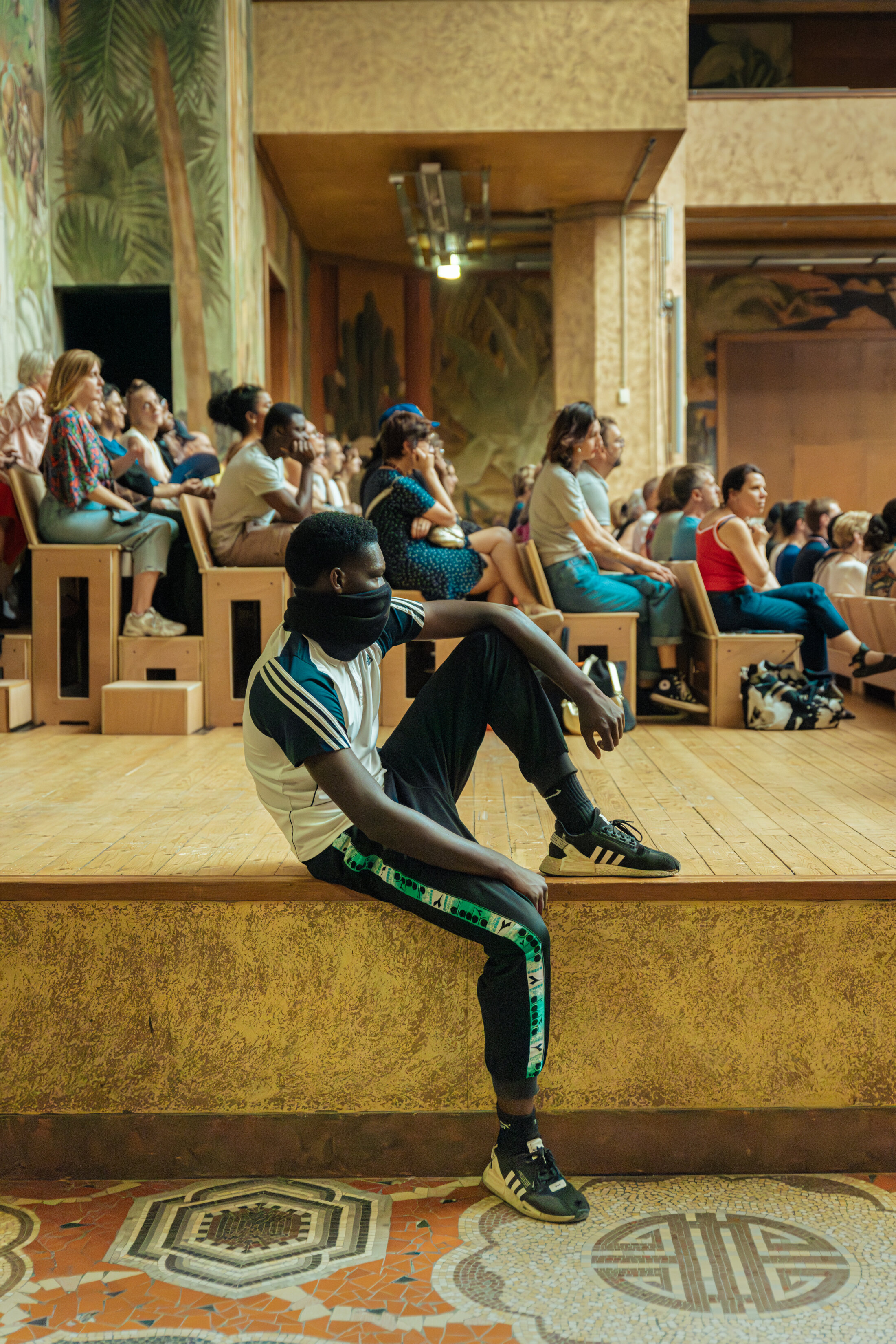 30 juillet, parvis du lycée Henri Bergson (19e). Comme toujours lors des créations programmées dans l’espace public par Paris l’été, une demi-heure avant le début du spectacle nous sommes tranquillement une vingtaine et lorsqu’il commence nous sommes avidement plus de trois cents. Le public adore ce festival.