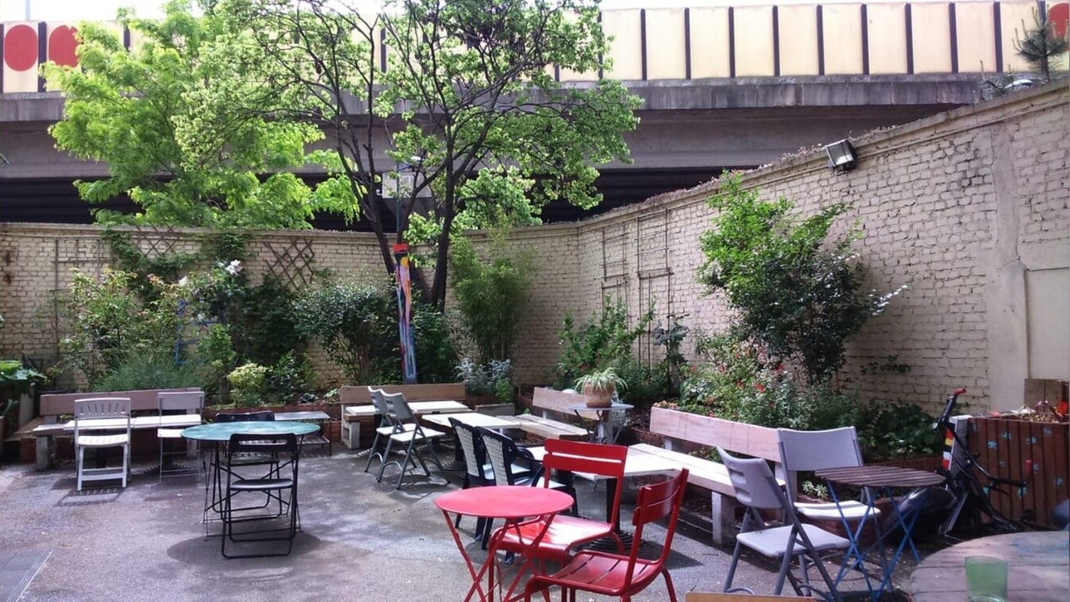 Lieu artisanal, sa décoration et ses aménagements intérieurs prennent forme avec le temps. Ils sont réalisés par des bénévoles de l’association : motifs ornementaux peints à la main et agrémentant les murs de la salle, nappes et coussins confectionnés à l’occasion d’ateliers de couture, meubles de rangement fabriqué lors d’ateliers de menuiserie, plantation d’arbustes et de plantes lors d’ateliers de jardinage, fresques extérieures faisant l’objet d’ateliers de graffs.