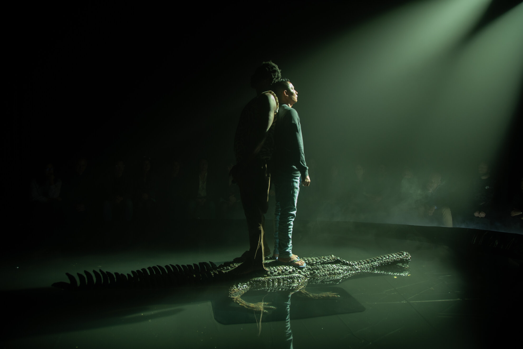 Dans la seconde séquence, deux humanités immobiles se tiennent dos à dos sur un crocodile, au centre d’une marre ovale encerclée par le public. C’est en voix off que le texte de Rivera résonne en langue Nukak, dans la brume et le bruissement de l’Amazonie.