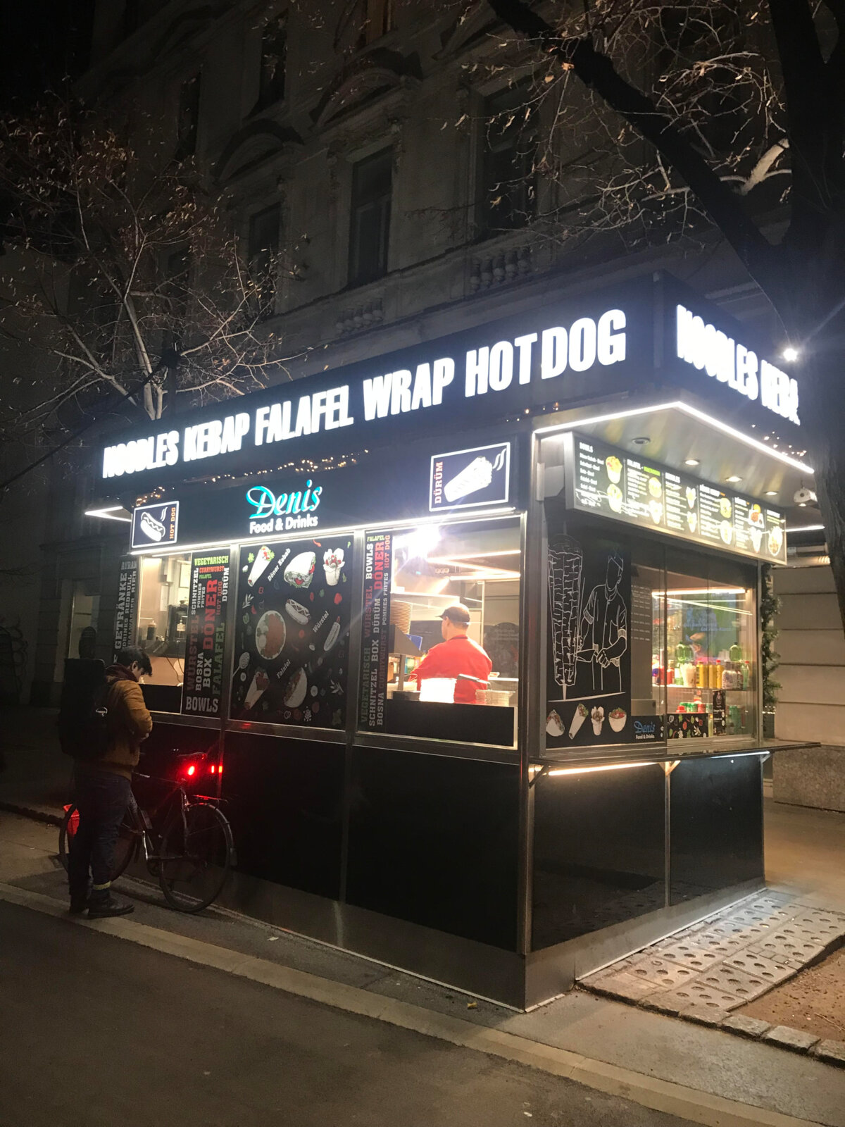 Un stand près de Karlsplatz à Vienne: l'offre est très diverse. On distingue le dessin d'un kebab. © Joëlle Stolz