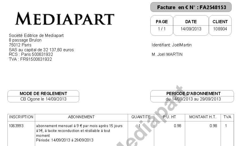 Chouette, je me suis dit, c'est comme treize à la douzaine, Mediapart pratique le seize à la quinzaine, faisant ainsi cadeau de la somme d'environ six centimes d'euro. C'est royal...