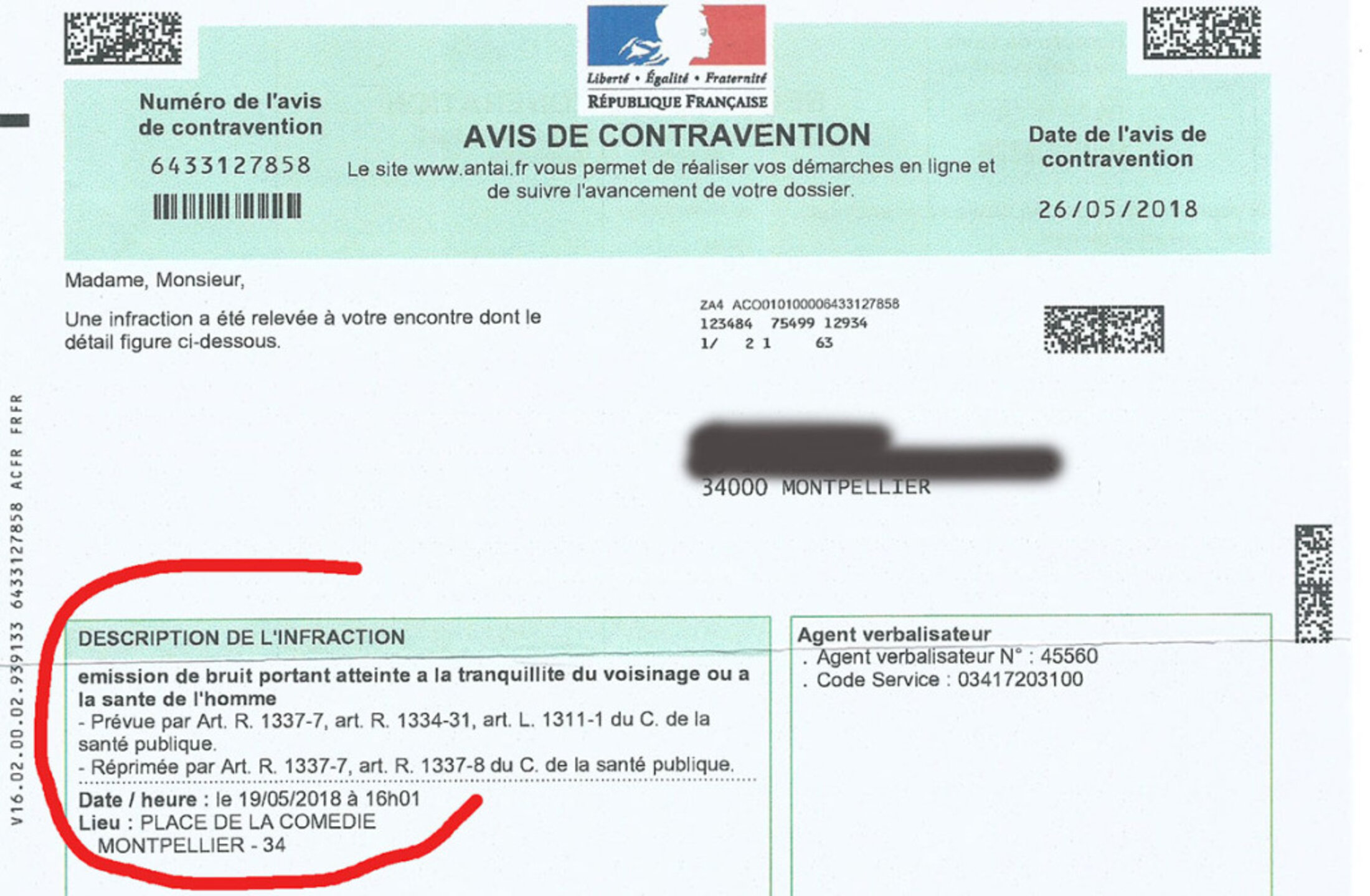 Une semaine plus tard José-Luis, militant BDS France, reçoit à son domicile une contravention de la police municipale pour : « Émission de bruit portant atteinte à la tranquillité du voisinage ou à la santé de l’homme » le 19 mai 2018 à 16h01, place de la Comédie.