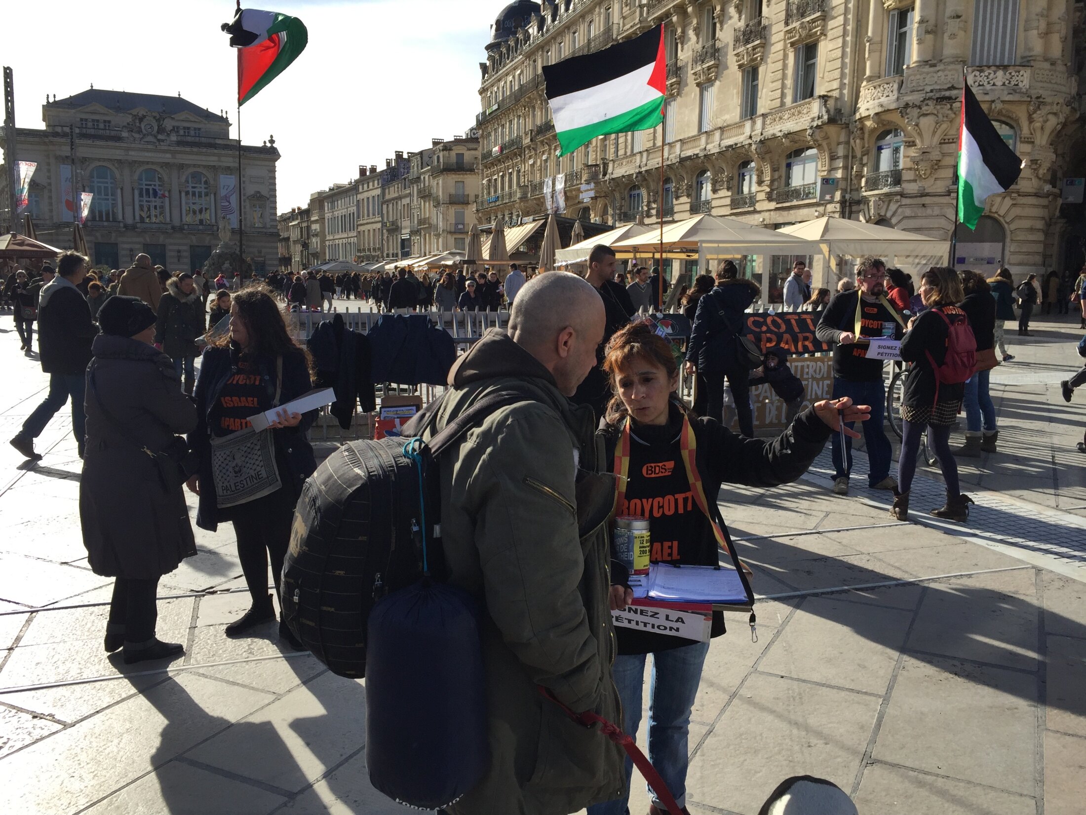 Répondant à l'appel de 20 associations, partis et syndicat, plus de cent militants-tes ont tenu une douzaine de stands sur la place de la Comédie à Montpellier le 5 novembre 2016 pendant plus de deux heures. Bravant ainsi les interdictions faites par la ville de Montpellier qui, aux ordres de la LICRA-CRIF, interdit toute expression publique du Comité BDS France 34 place de la Comédie et les intimidations de la préfecture qui convoque à la police les militants BDSF34 pour port du T-shirt "Boycott Israël Apartheid".