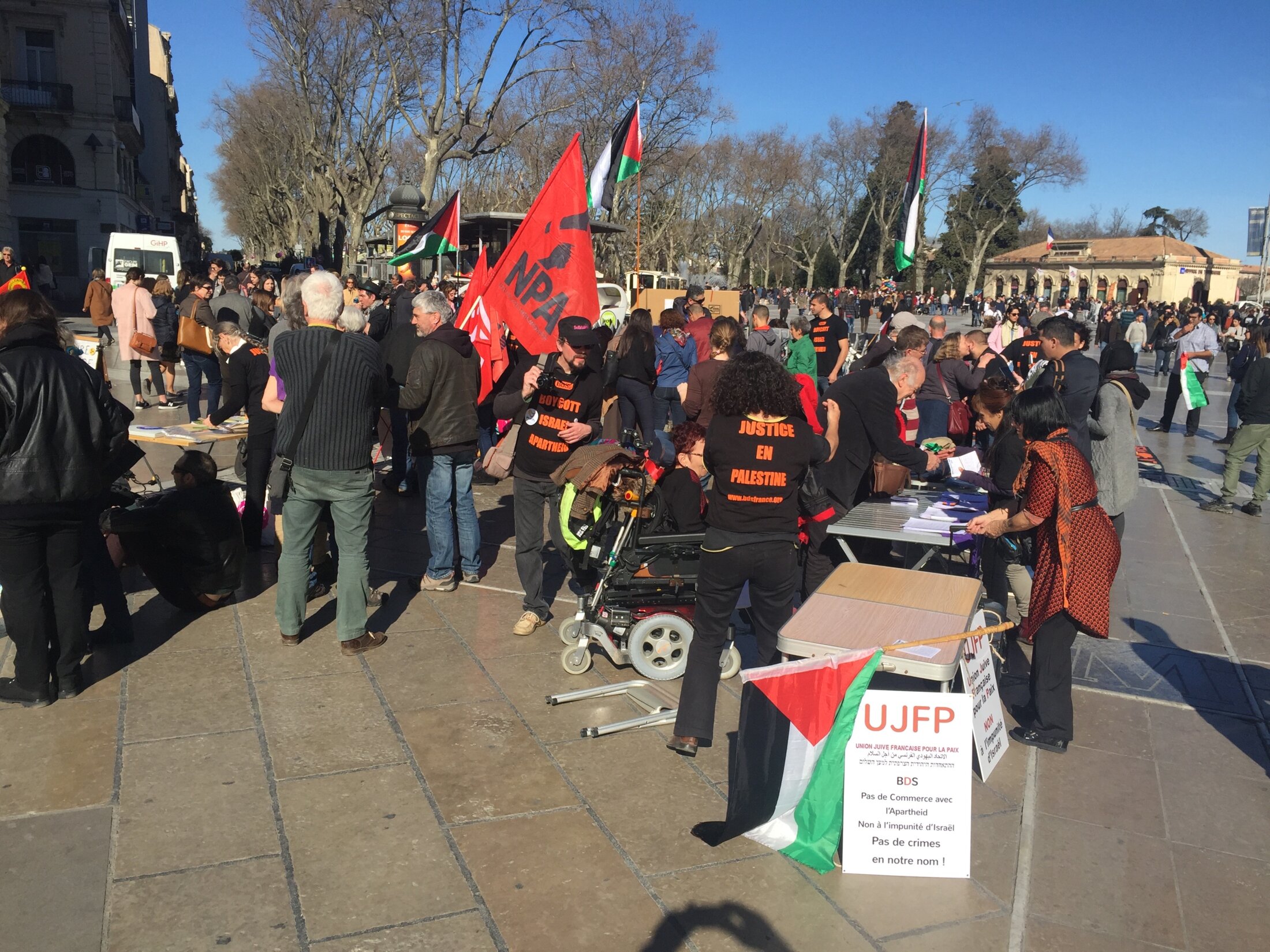 EN 2017 et début 2018, 7 demandes d’autorisation de tenue de stand « solidarité avec la Palestine » place de la Comédie ont été déposées par 3 associations (CCIPPP34, Podemos Montpellier et le MAN), toutes ont été refusées au nom des risques « terroristes », de l’État d’urgence » etc. certaines fois il a été proposé d’aller Place Bec (sortie polygone vers Antigone) où passent très peu de gens.