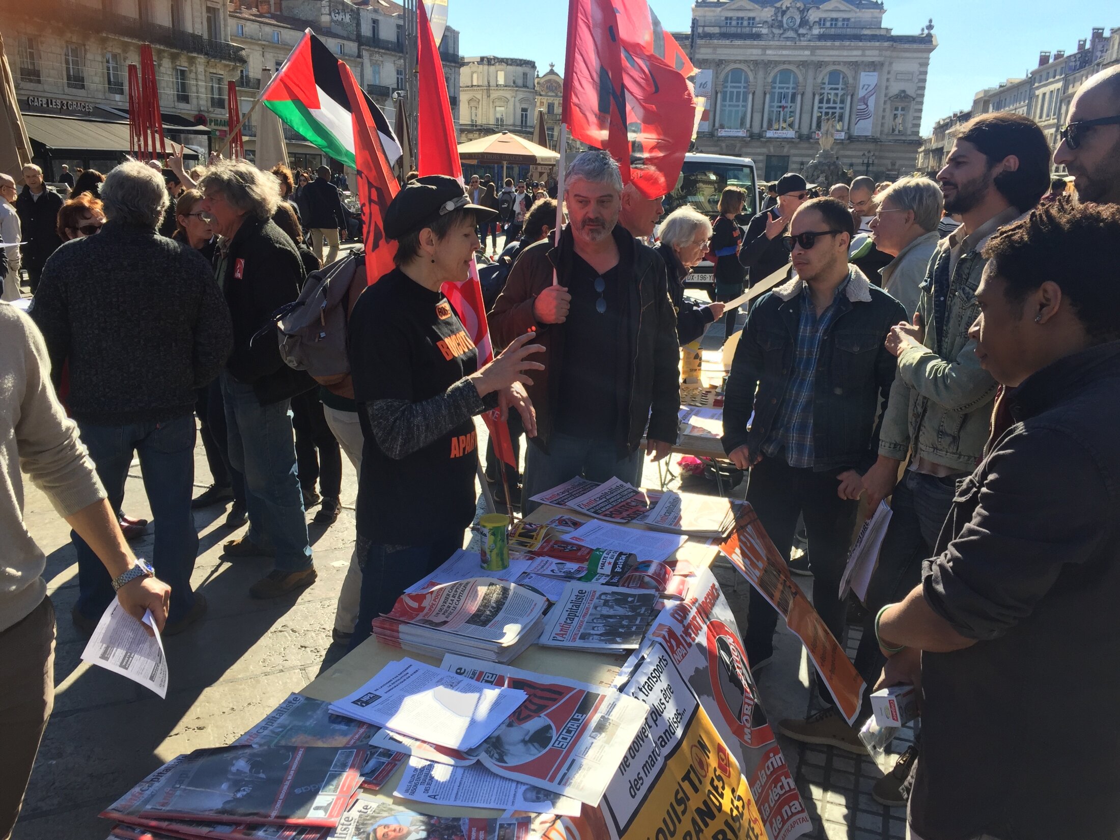 Depuis le samedi 6 avril 2018, chaque samedi (jusqu'en juillet) BDS France Montpellier a tenu son stand place de la comédie en soutien à la première Grande Marche du Retour à Gaza et ce malgré les interdictions abusives de la Mairie.