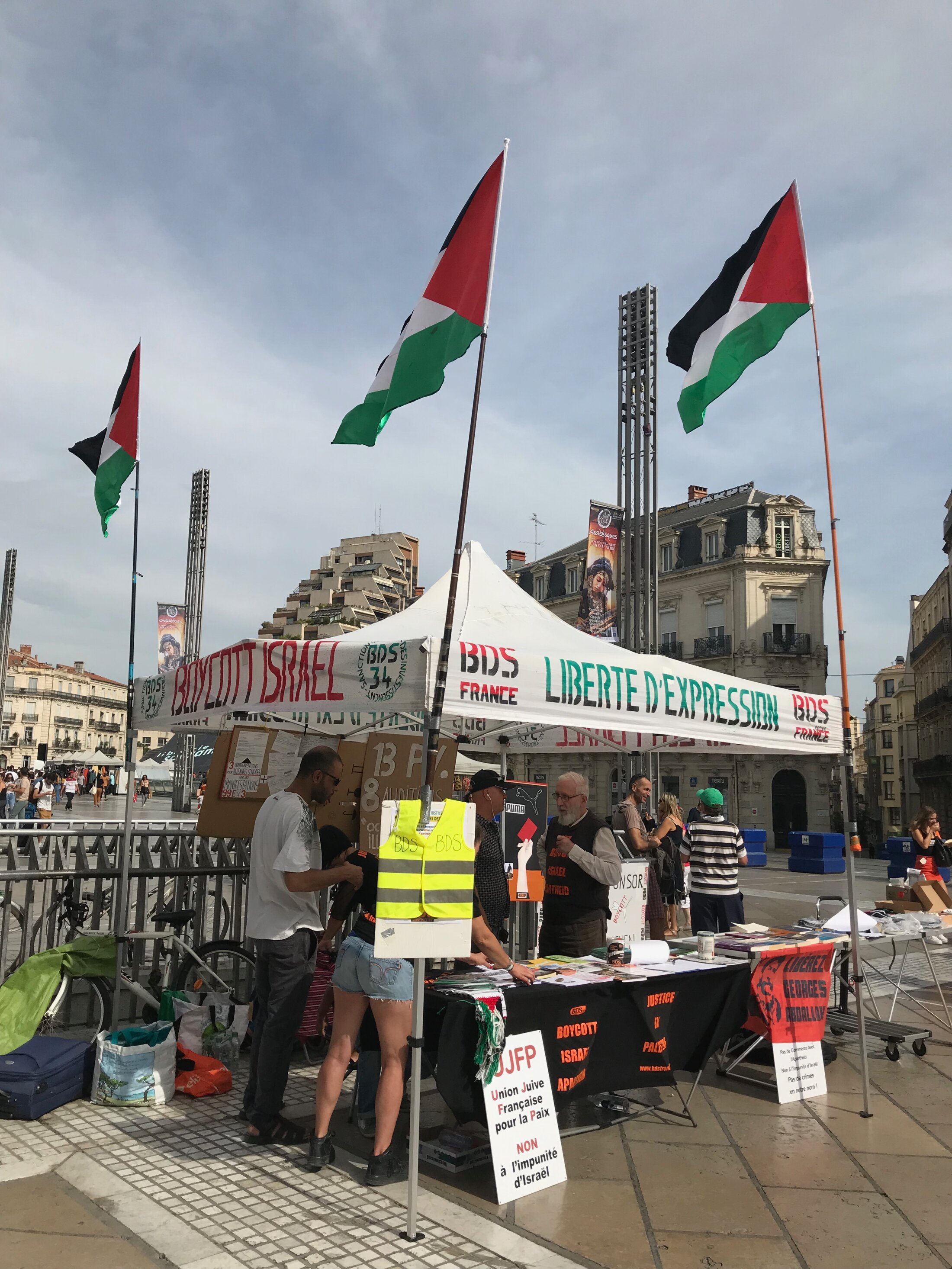 BDS Montpellier remercie les Gilets Jaunes dont l’action exemplaire de soutien non-violent face à la police place de la Comédie a permis, du 12 janvier 2019 à la mi-juillet, la tenue du stand BDS sans intervention policière ni PV.