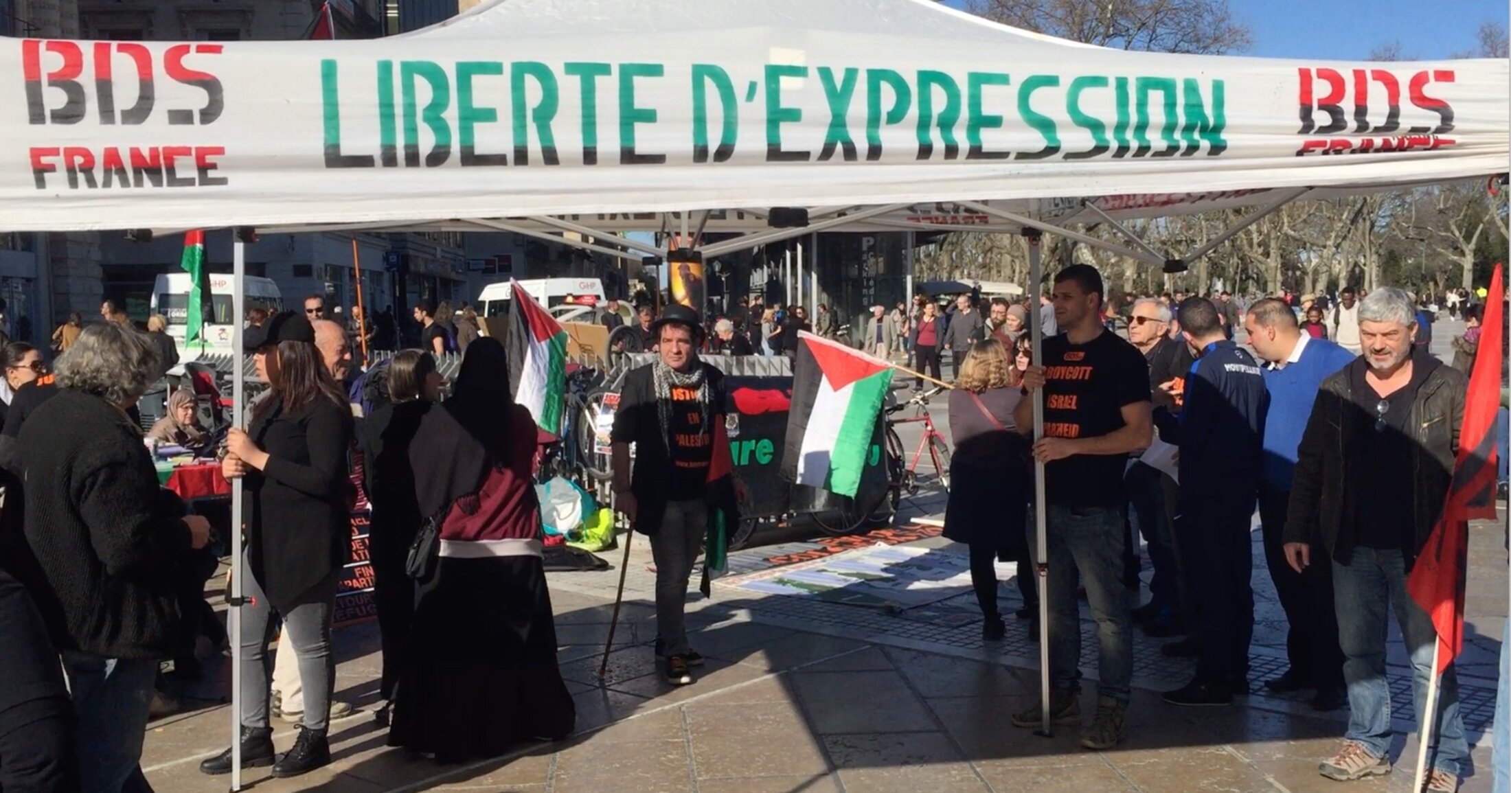 Le 17 octobre 2015 la police nationale attaque et détruit le chapiteau BDS place de la Comédie. Le premier PV pour « occupation illégale de l’espace public » est dressé contre BDS France Montpellier. https://wordpress.com/post/bdsf34.wordpress.com/2846