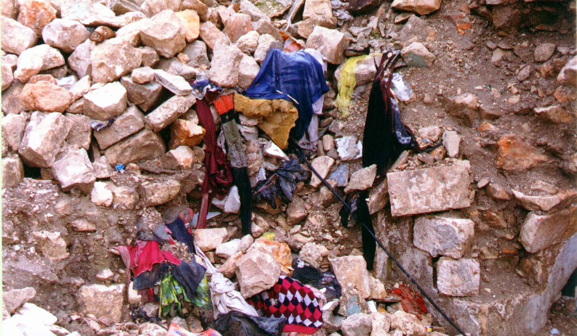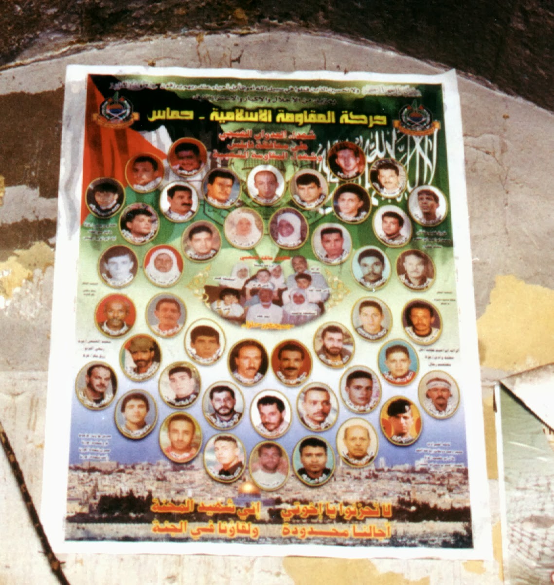 Les photos prises au deux bords extrêmes de la méditerranée semblent étrangement semblables. Mais les photos ne disent pas tout. Nous ne connaissons pas encore la suite de l’histoire des roms expulsés à Perpignan et nous espérons qu’une protestation unitaire nous rassemblera au plus vite dans la rue. Mais au camp de Naplouse en 2002, l’expulsion avait tourné à la tragédie. L’armée israélienne avait sommé la famille de quitter les lieux mais personne n'était encore sorti que les bulldozers écrasaient la maison avec ses habitants à l’intérieur. Il ne restait plus, lors de notre passage, que ces quelques vêtements en charpie sous les pierres. Et il y avait aussi une affiche collée sur un mur voisin avec les photos de la famille martyre de la maison du camp : hommes, femmes, et enfants Nous pûmes entendre le témoignage encore plein de douleur des voisins de l’habitation détruite. Ils gardaient l'image du petit cartable sortant des gravats auquel était encore accrochée la main de l'enfant, mort sous les décombres.