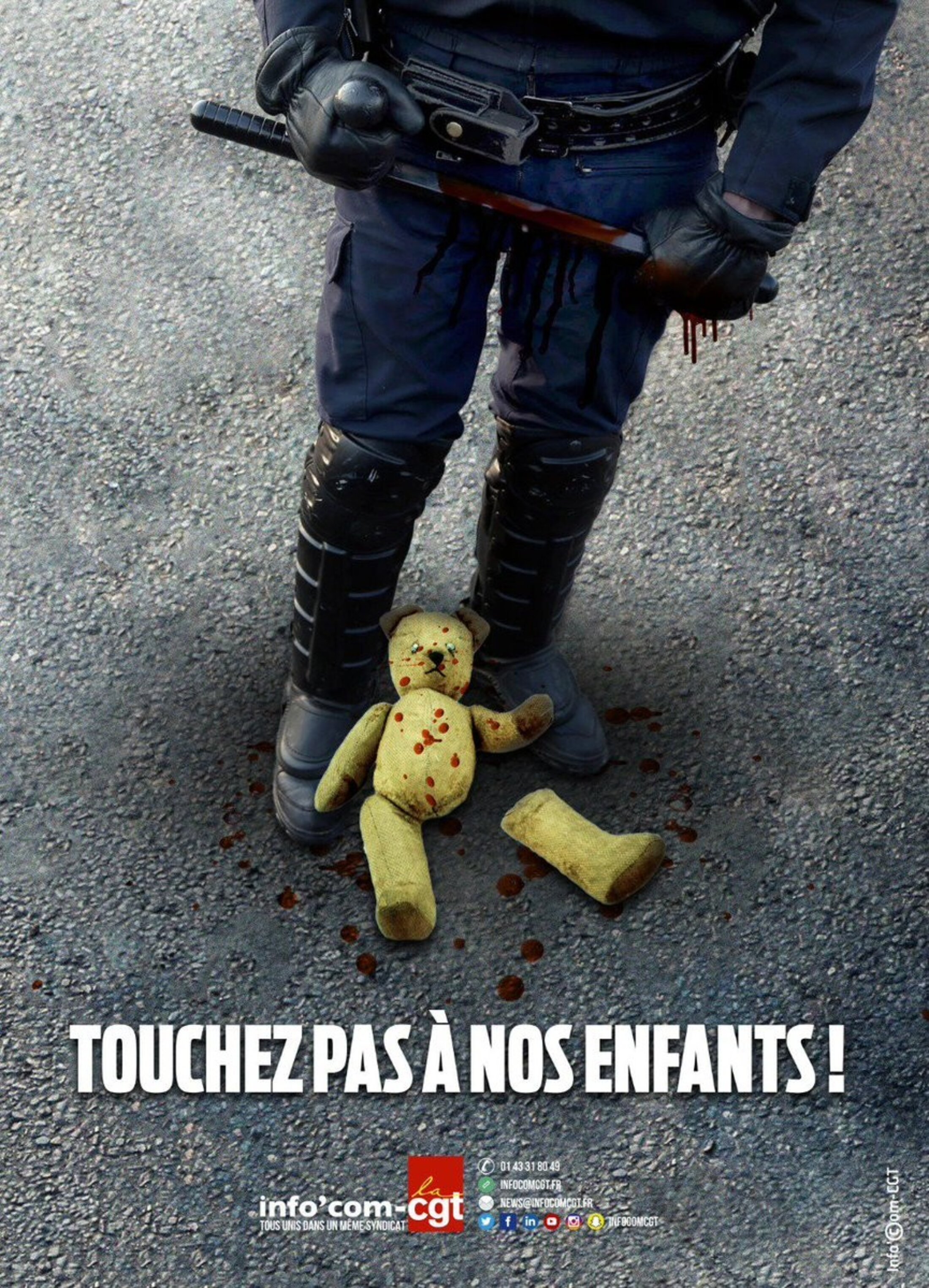 Le ministre M. Castaner déclenche une procédure pénale contre le syndicat InfoComCGT à cause de cette affiche qu'il ne faut donc pas partager.