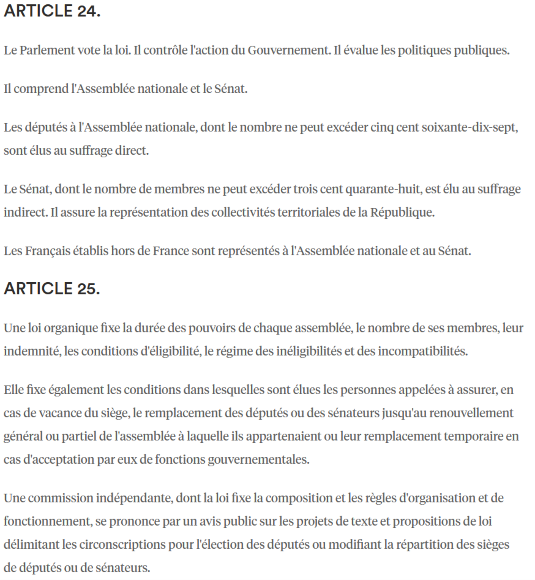 Pour qui a lu la constitution avant cette modification, l’intitulé évoque deux autres articles du même texte. Ceux-ci renvoient à un débat d’actualité en 2025, dont la teneur permet de mieux comprendre la portée de la loi de 2024. Il s’agit des articles 24 et 25 de la constitution qui sont relatifs aux modalités d’élection des députés :