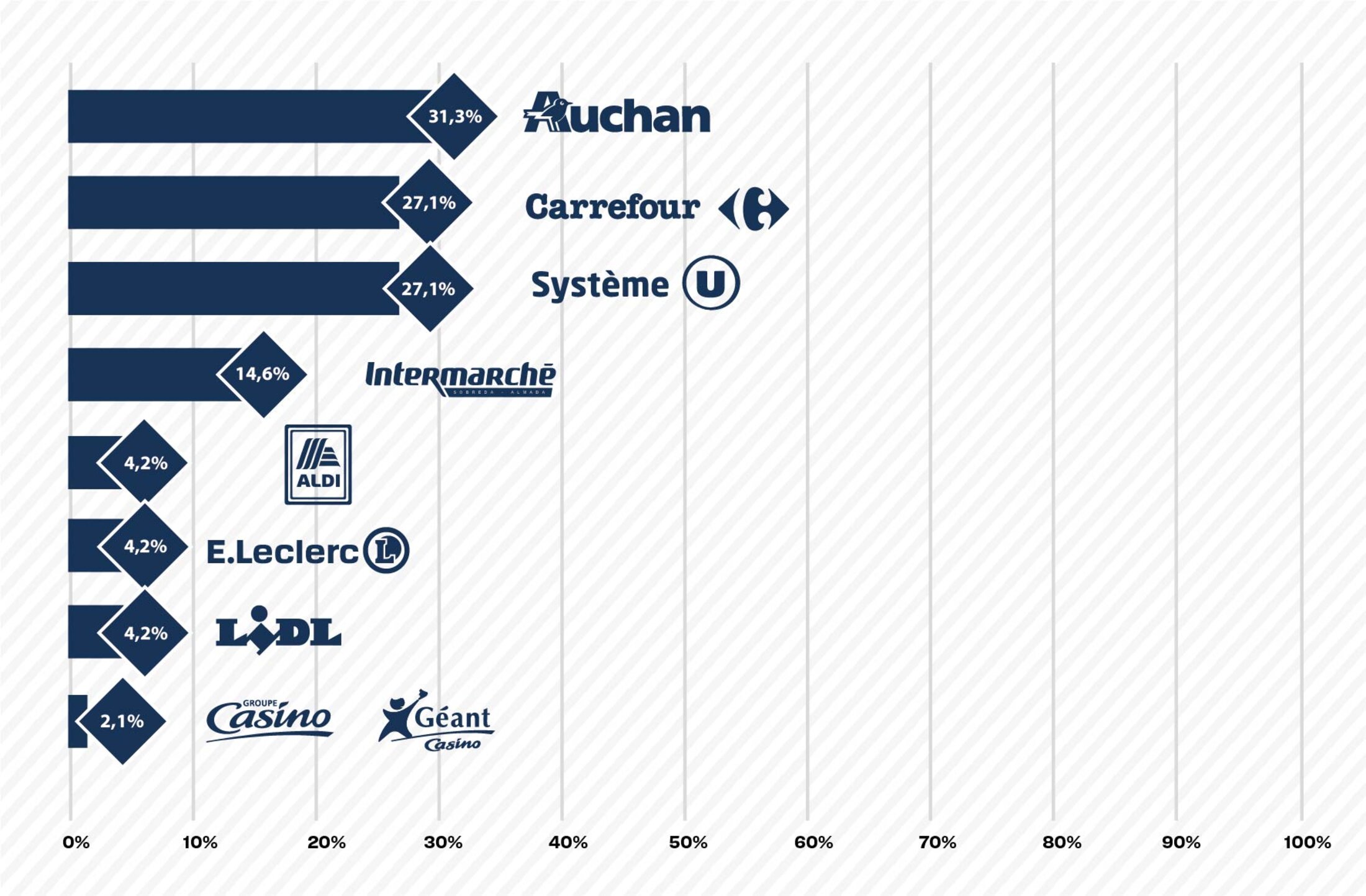 Quatre des huit supermarchés analysés obtiennent un score inférieur à 5%, Casino termine en bas de la liste avec 2,10%, Intermarché obtient seulement 14,60 % et seul Auchan a un score supérieur à 30 %.