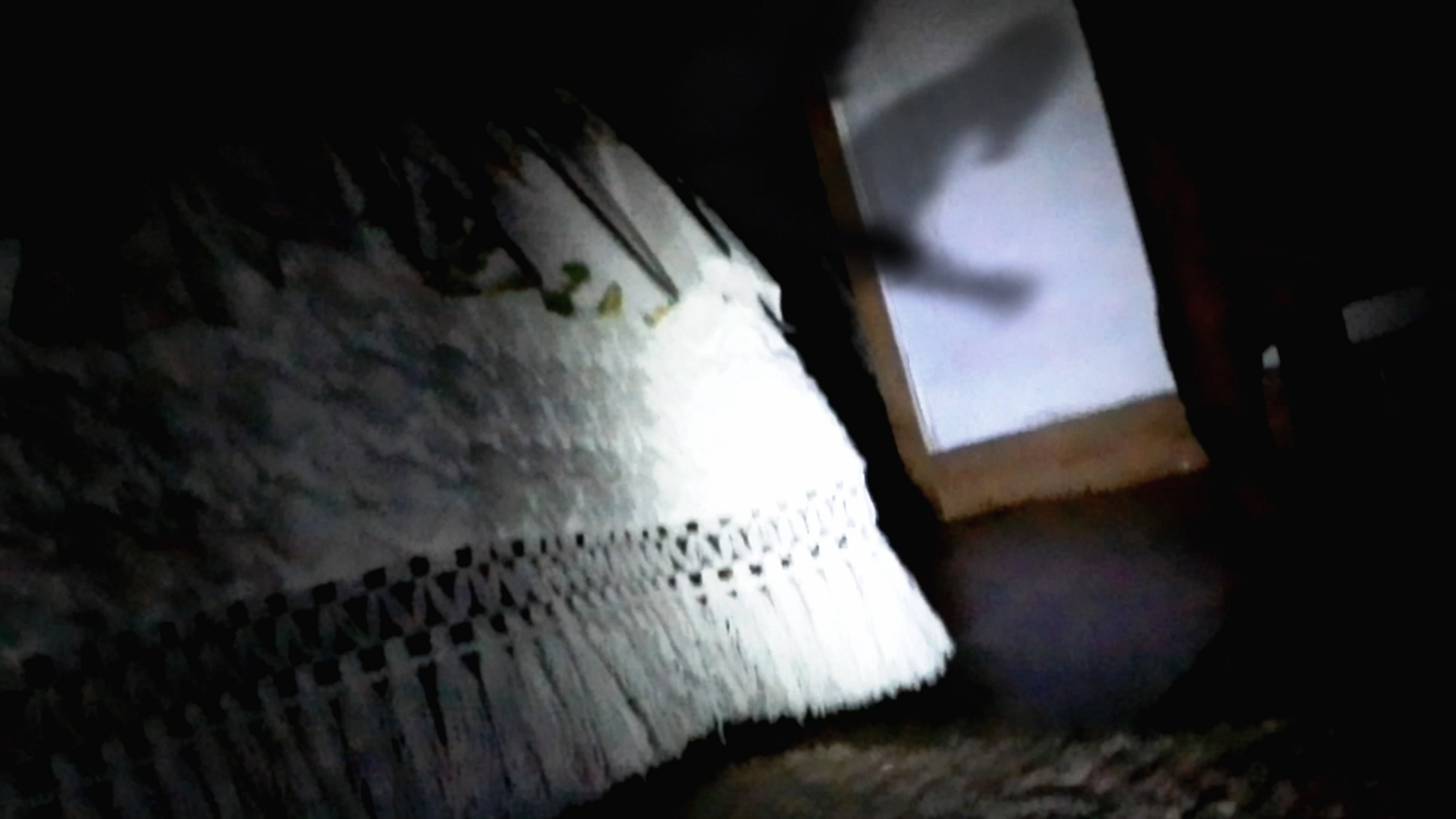 If this one is effectively from real footage, that is certainly one of the weirdest image I've ever seen in my life. The camera is apparently located near a bed and someone -or something- is crossing the screen from left to right. What is probably the most frightening fact is that the poor quality of the footage clearly indicates no green background was involved in any kind of visual effects, which are known to require a strong amount of light. This is necessarily "home-made" or, and it seems plausible, just paranormal. Not only because the character's face looks bizarre, but especially because his walk and attitude is totally unhuman. Who can move like this, honestly? Maybe an animal, but not with that height.