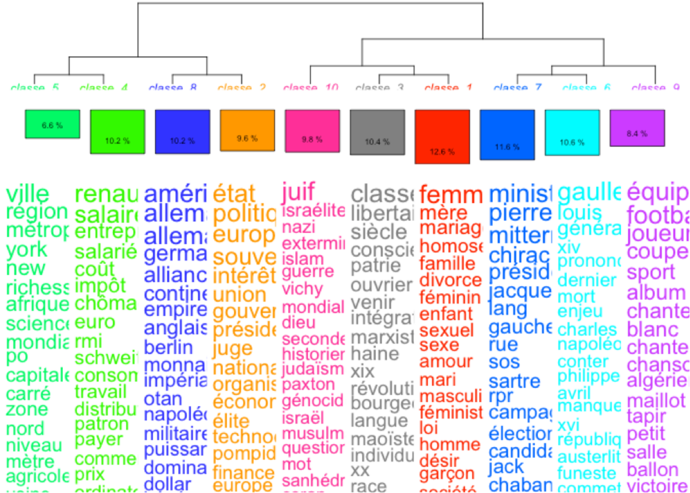 Une analyse exhaustive n'est pas possible ici (elle est en cours pour une communication scientifique à venir), mais si on s'arrête au "score" les plus élevé, on constate ainsi que le thème le plus mobilisé est celui qui contient les termes "femme, mère, mariage, homosexuel, famille, divorce etc." (classe 1, 12,6% des segments de texte). Aussi, si un effort important est fait par l'auteur pour faire un découpage chronologiquee, s'appuyer sur des événements précis, une analyse générale du propos indique qu'un de ses thèmes de prédilection est ici saillant, tel que cela avait été visible aussi lors de la convention des droites: