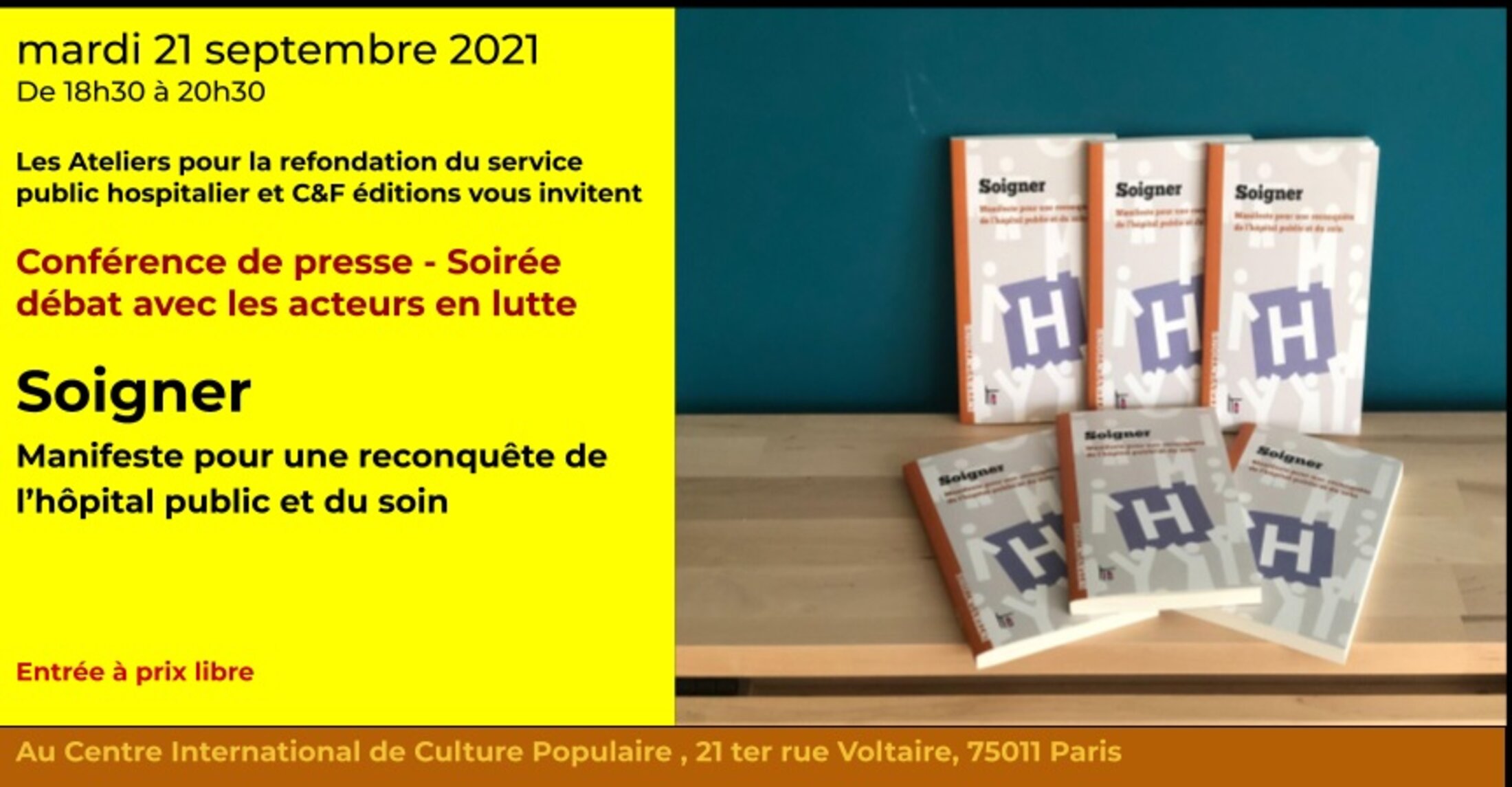 A l’occasion de la parution de notre ouvrage « Soigner-Manifeste pour une reconquête de l’hôpital public et du soin » (https://cfeditions.com/soigner/) nous vous invitons à une conférence de presse et une soirée débat avec les acteurs en lutte
