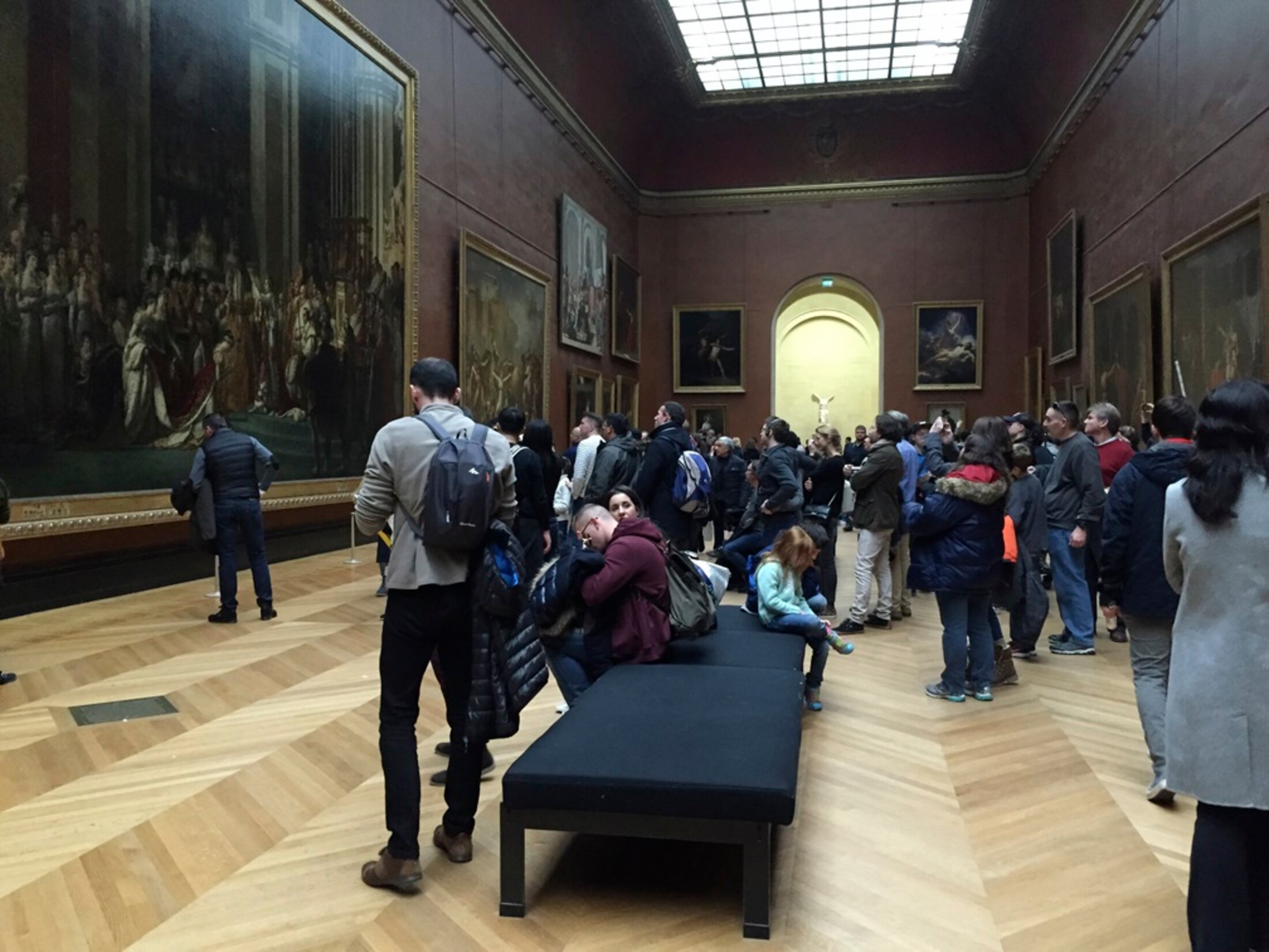 La réussite est éclatante : près de neuf millions de clients se pressent chaque année dans les travées de ce centre commercial vintage aux allures de parc de loisirs. Les cinq continents défilent, un peu essoufflés, sous la victoire de Samothrace et suivent l'itinéraire balisé qui les mènera sans s'égarer jusqu'à la Joconde. On se presse dans la grande galerie des peintures italiennes comme dans la rue de Rivoli un samedi de soldes puis, épuisé par la longueur des couloirs et des escaliers, on fait une halte pour se désaltérer à l'ombre du grand Carrache. On en profite pour bavarder à l'aise, mettre à jour son profil Facebook, jouer une ou deux parties de Mario ou lire le dernier chapitre d'un polar palpitant. Et l'on reprend bravement le parcours, en suivant bien les flèches et les étapes obligées. L'épreuve la plus difficile consiste à étendre le bras assez long pour photographier plein cadre le gigantesque couronnement de Napoléon sans se faire écraser les pieds. Un jeune garçon s'arrête, médusé, devant les rondeurs éthériques d'une nymphe accrochée haut mais on l'appelle, andiamo, andiamo, il reste tant à faire. Pas le temps de lambiner : pour quinze euros l'entrée plein pot, il ne faut pas rater Michel Ange. La dame déplie la carte et s'interroge : elle voudrait un selfie devant l'Esclave mourant ; si elle ne le trouve pas, elle se rattrapera dans le métro. Deux pépés sourient devant la Ménine, un homme à chapeau observe longuement un Greco qui, miracle, n'intéresse que lui. Un bébé couine dans sa poussette ; pour l'occuper Maman lui glisse une tablette et roule, roule pour rattraper les autres, en slalomant entre les petits groupes agglutinés devant les must-see. On s'écarte : une cohorte passe, le nez en l'air mais à grandes enjambées, menée par un éclaireur brandissant en étendard une fleur artificielle piquée à la pointe d'un bâton de ski. Encore trois kilomètres pour se faire peur avec la momie et on aura bien mérité la récompense d'un cadeau dans les magasins du Carrousel. Demain, on fera Orsay où il paraît qu'aucune tenue n'est exigée.