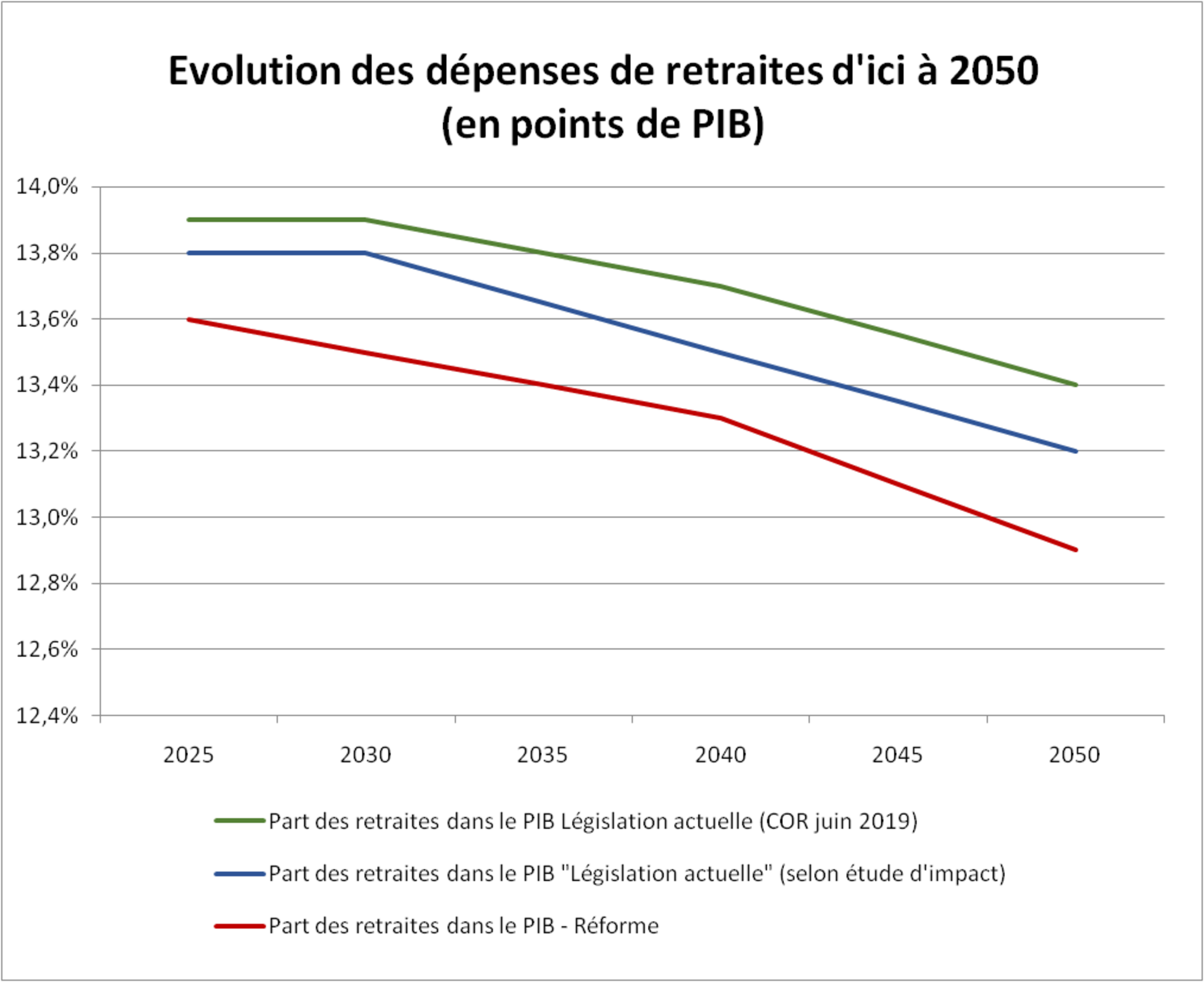 La trajectoire financière affichée par le gouvernement présente donc bien des dépenses en baisse par rapport à celles du système actuel. L’ampleur de cette diminution varie selon la « trajectoire actuelle » retenue, mais s’élève, a minima, à 0,3 points de PIB dès 2030, et ce jusqu’en 2050.