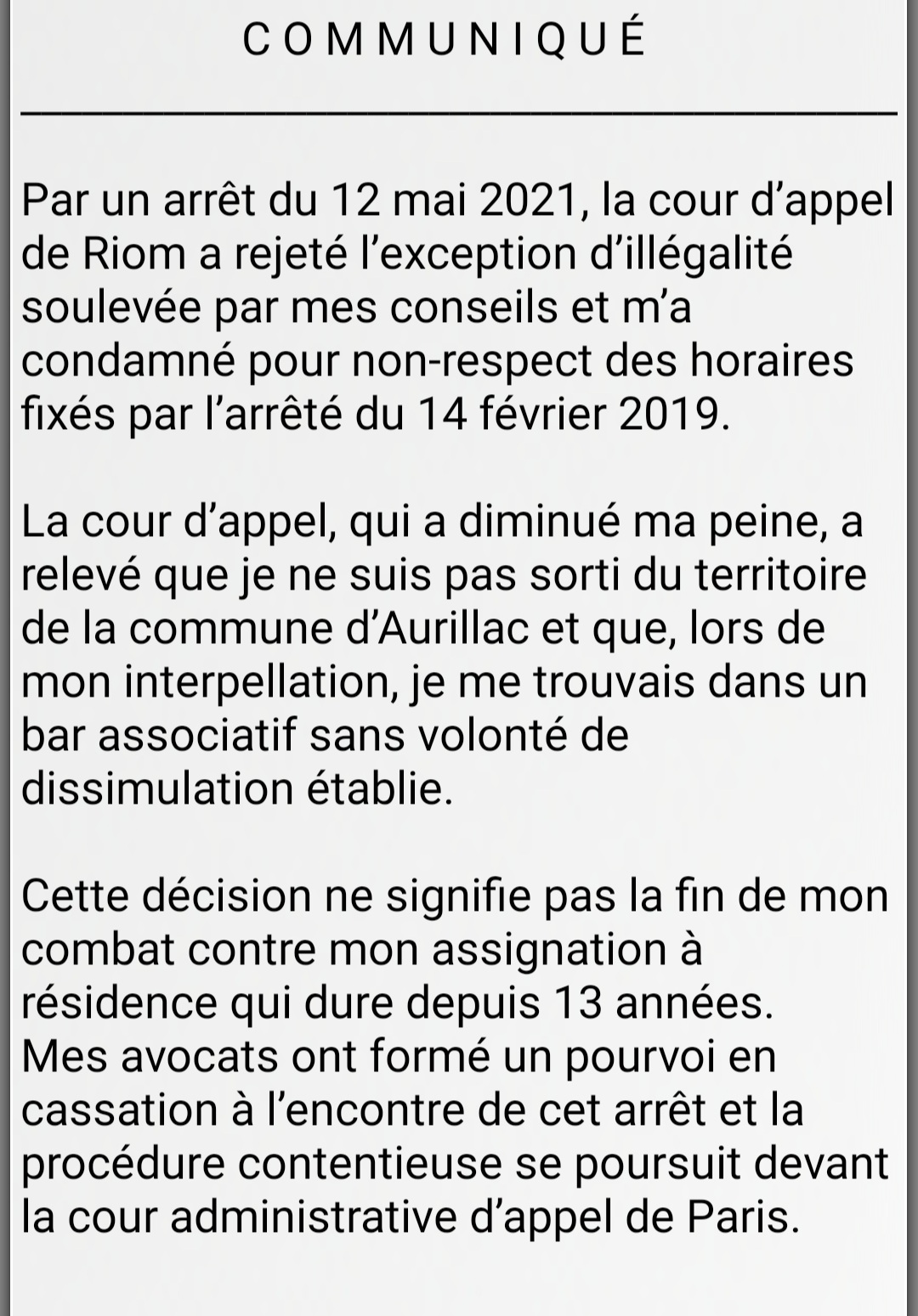 J’ai décidé de me pourvoir en cassation car je ne peux me résoudre à accepter cette décision. Certes, elle abrège la peine de prison de 1 an ferme requise et décidée en première instance par le tribunal judiciaire d’Aurillac et la réduit en une peine plus courte couvrant intégralement le quantum de peine que j’ai déjà exécuté dans le quartier d’isolement de la Maison d’arrêt de Lyon-Corbas. Mais prendre 4 mois de prison ferme pour 25 minutes de retard à un couvre-feu après 13 années d’assignation à résidence et plus de 14 000 « pointages » au compteur, cela laisse un goût amer.