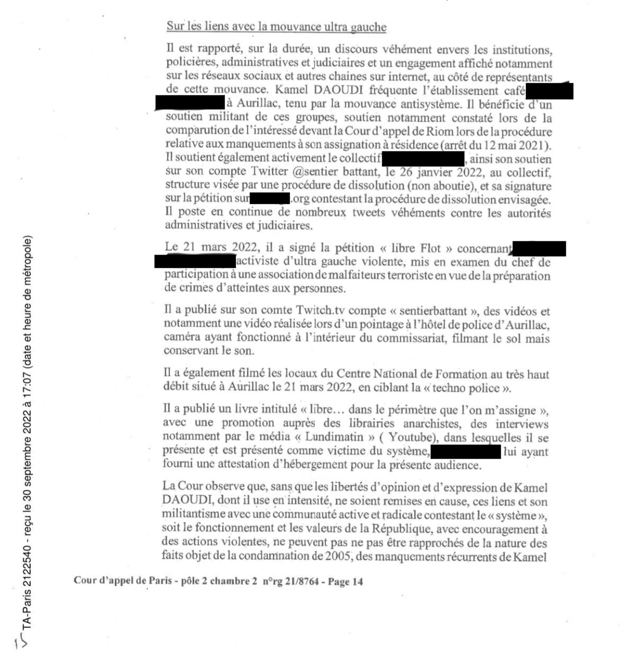 Je m’appelle Kamel Daoudi. J’ai été condamné en première instance à 9 ans ferme par le TGI de Paris, le 15 mars 2005. J’ai interjeté appel de la décision en première instance. J’ai été condamné à 6 ans ferme par la CA de Paris, le 14 décembre 2005. La condamnation principale a été assortie à chaque décision d’une peine complémentaire : l’interdiction définitive du territoire français.