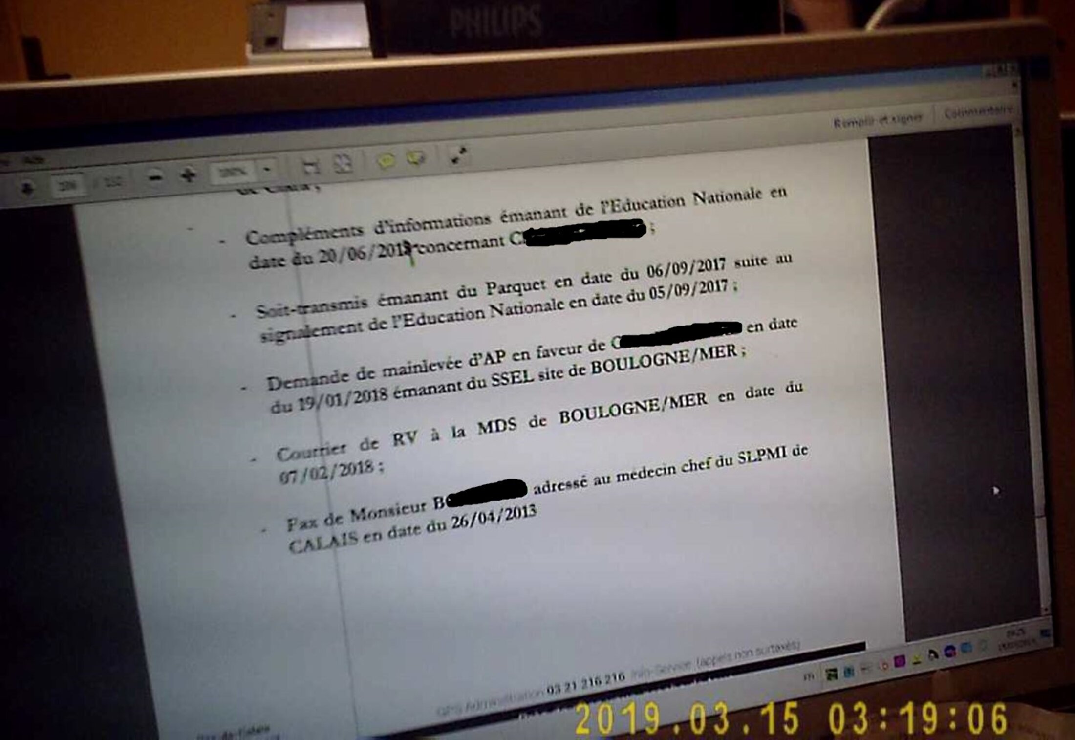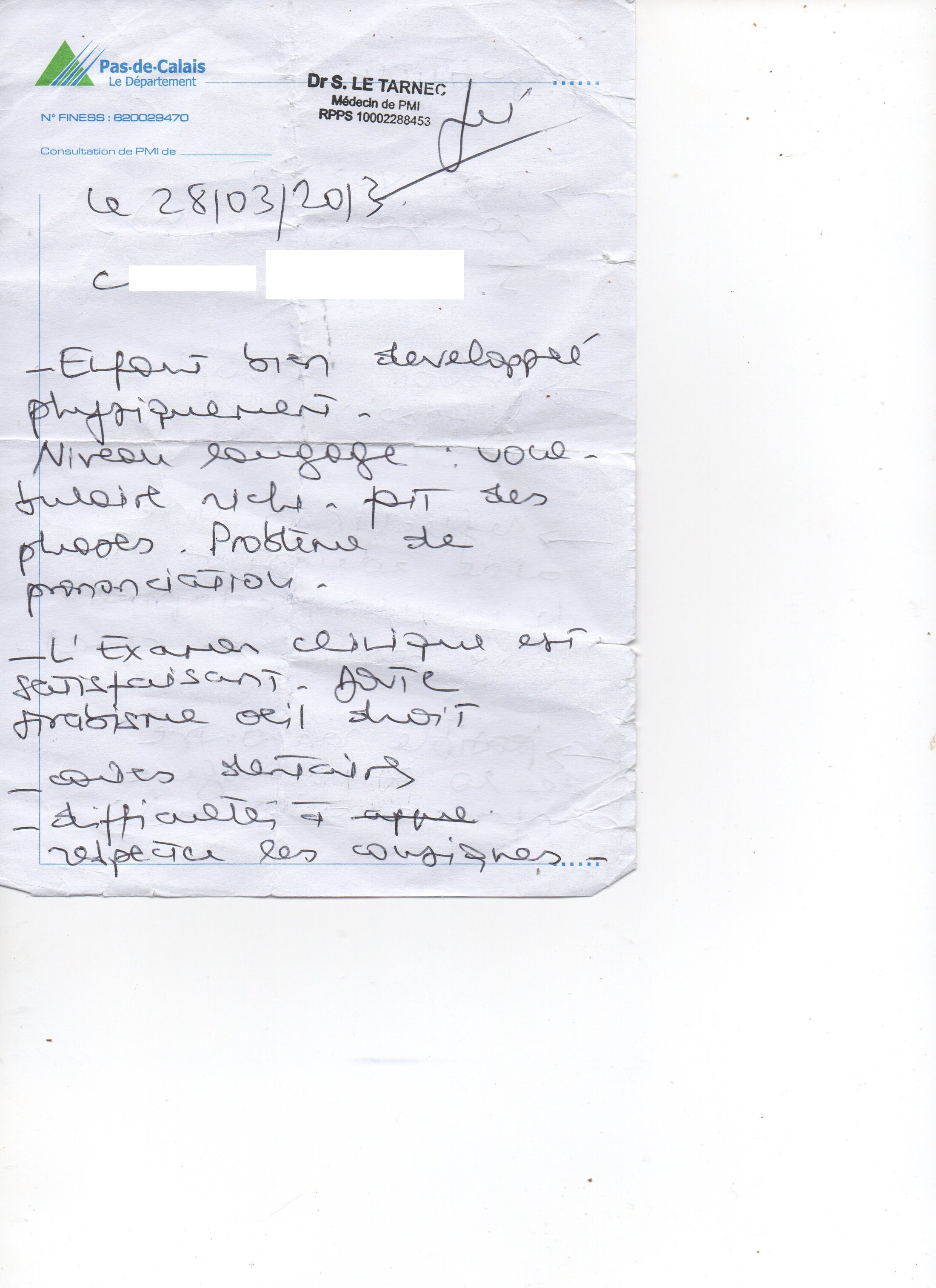 Donc nos 3 comparses ont dans un document transmis à Ahmed Benslimane juge des enfants le fait qu'un fax fus envoyé le 26 Avril 2013 au service de l'aide sociale à l'enfance du pas de calais indiquant un refus. Bien entendu cela reste bien essayé pour leurs part car cela démontre la non collaboration des parents dans cette affaire. Mais en cherchant bien dans les dossier car oui dans le cadre de l'assistance éducative il faut absolument gardé chaque lettre chaque rapports de leurs services, il a été retrouvé le compte rendu de cette visite qui justement avait eu lieu 1 moi auparavant par le médecin de PMI (Protection maternelle et infantile), qui indique avoir vu C.... en consultation pour son bilan des 4 ans.
