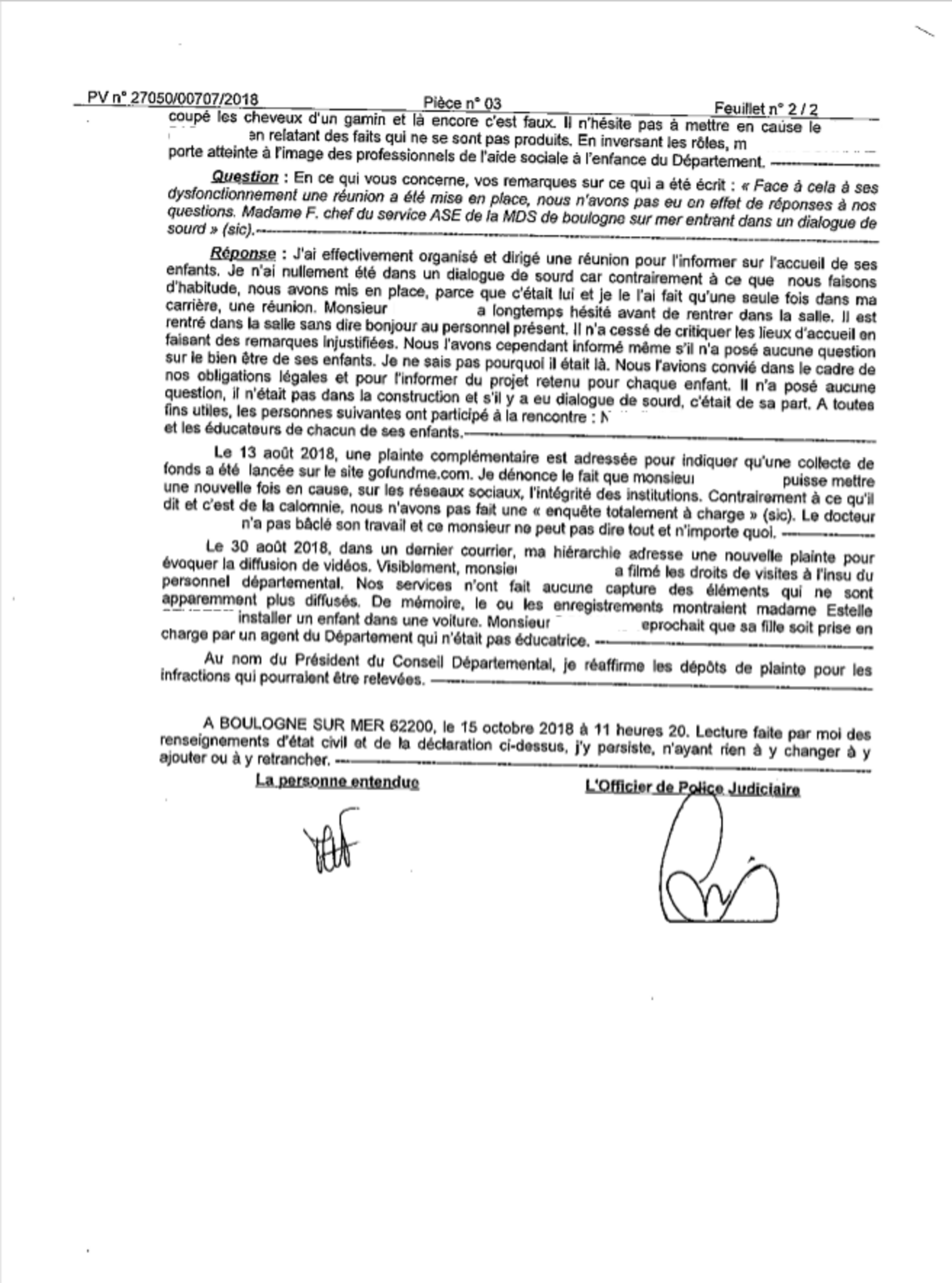 Mais la ou l’erreur est encore plus grosse est celle d'une assistante socio éducative qui dans sa déposition affirme dans sa déposition avoir fait un faux, avoir menti dans le rapport transmis au magistrat, chose grave en soit car cela engage la responsabilité du département et de son président car il est garant de ses agents