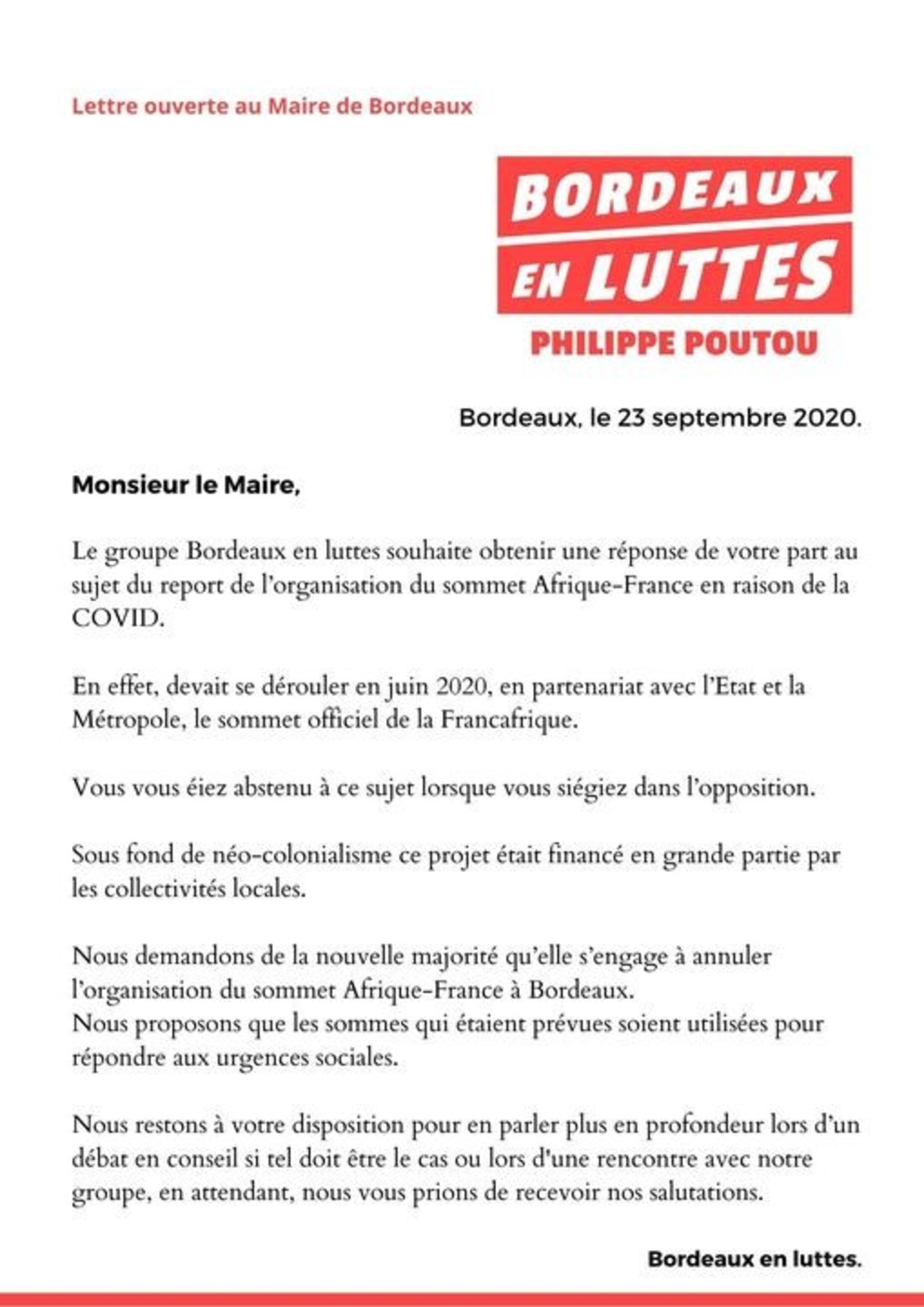 Le journaliste omettant même d’évoquer la lettre ouverte du groupe politique d’opposition Bordeaux en Luttes, menée par Philippe Poutou, qui, dés le 23 septembre, interpelle le maire de Bordeaux « pour qu'il s'engage à annuler le sommet Afrique-France (…) Ce sommet, reporté pour cause de COVID, est un résidu colonialiste de l'emprise de la France sur des pays africains. Sur fond de néocolonialisme ce projet était financé en grande partie par les collectivités locales. Nous demandons que les 250 000 euros, prévus par la ville de Bordeaux pour organiser ce sommet, soit utilisés pour lutter contre la crise sociale ! » (voir ci-dessous)