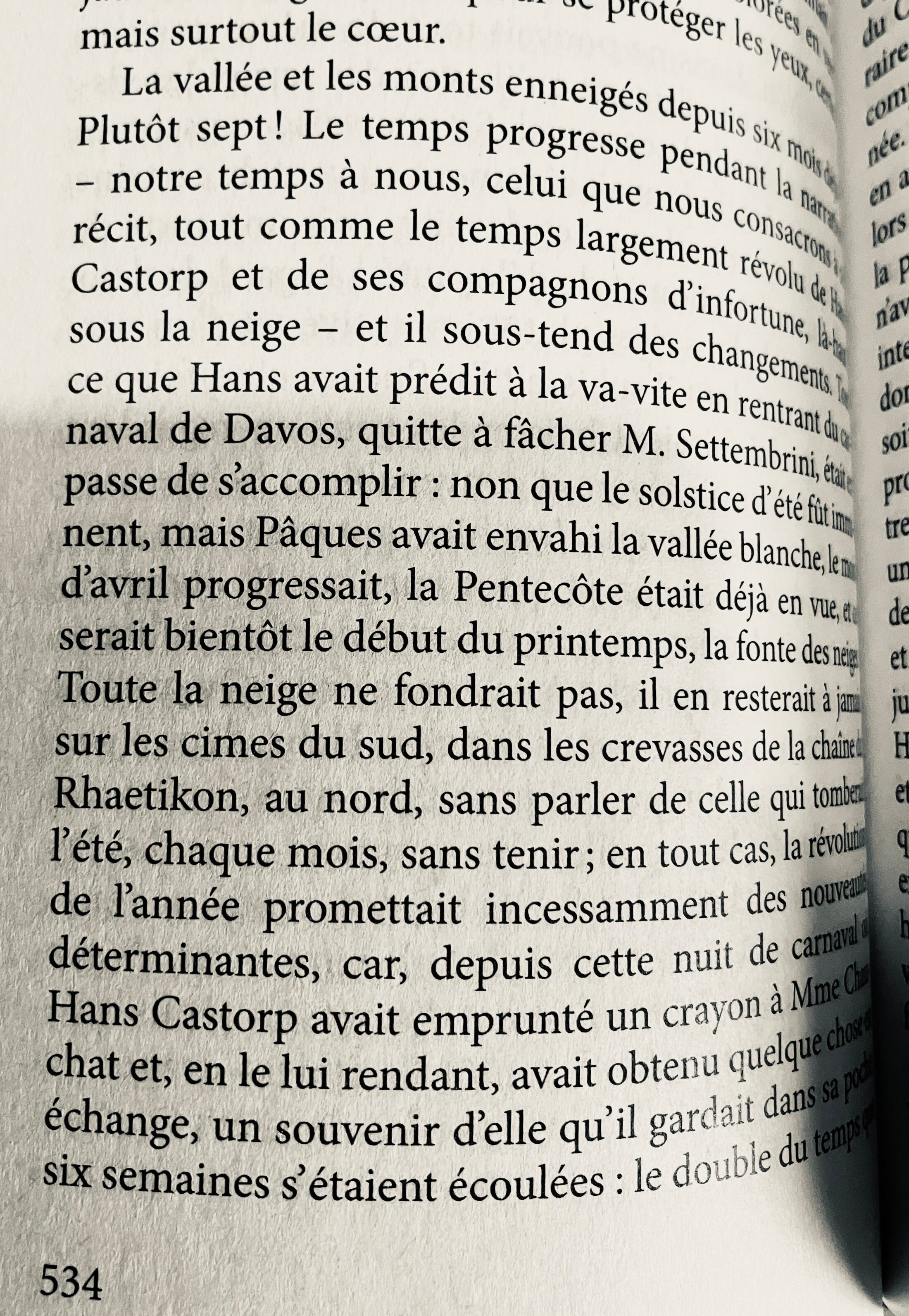 …je partis me promener seul vers cette grande route que prenait la voiture de Mme de Villeparisis quand nous allions nous promener avec ma grand’mère ; des flaques d’eau, que le soleil qui brillait n’avait pas séchées, faisaient du sol un vrai marécage, et je pensais à ma grand’mère qui jadis ne pouvait marcher deux pas sans se crotter. Mais, dès que je fus arrivé à la route, ce fut un éblouissement. Là où je n’avais vu, avec ma grand’mère, au mois d’août, que les feuilles et comme l’emplacement des pommiers, à perte de vue ils étaient en pleine floraison, d’un luxe inouï, les pieds dans la boue et en toilette de bal, ne prenant pas de précautions pour ne pas gâter le plus merveilleux satin rose qu’on eût jamais vu et que faisait briller le soleil ; l’horizon lointain de la mer fournissait aux pommiers comme un arrière-plan d’estampe japonaise ; si je levais la tête pour regarder le ciel entre les fleurs, qui faisaient paraître son bleu rasséréné, presque violent, elles semblaient s’écarter pour montrer la profondeur de ce paradis. Sous cet azur, une brise légère mais froide faisait trembler légèrement les bouquets rougissants. Des mésanges bleues venaient se poser sur les branches et sautaient entre les fleurs, indulgentes, comme si c’eût été un amateur d’exotisme et de couleurs qui avait artificiellement créé cette beauté vivante. Mais elle touchait jusqu’aux larmes parce que, si loin qu’on allai dans ses effets d’art raffiné, on sentait qu’elle était naturelle, que ces pommiers étaient là en pleine campagne comme des paysans, sur une grande route de France. Puis aux rayons du soleil succédèrent subitement ceux de la pluie ; ils zébrèrent tout l’horizon, enserrèrent la file des pommiers dans leur réseau gris. Mais ceux-ci continuaient à dresser leur beauté, fleurie et rose, dans le vent devenu glacial sous l’averse qui tombait : c’était une journée de printemps.