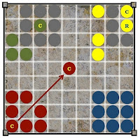 Le Chef, qui le premier, occupe la case centrale, devient propriétaire des pièces vivantes du ou des Chefs encerclés, s'il y en a, et qui deviennent ses satellites.