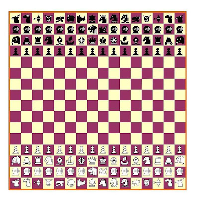 - au troisième rang :un Roi, une Reine, deux Bouffons, deux Bateaux, deux Fous, deux Cavaliers, deux Tours, deux Machines de Siège et deux Éléphants
