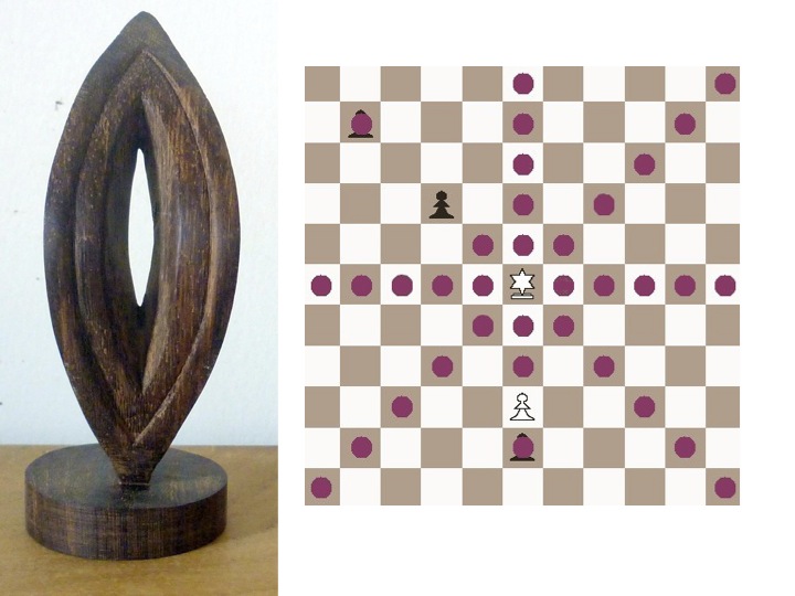 - Arc (2) : Son mouvement ressemblerait à celui du Fou et il a besoin d'une pièce intermédiaire entre lui et sa victime pour la capturer. L'Arc saute donc la pièce intermédiaire sans la prendre et atterrir sur sa victime en la prenant par substitution.