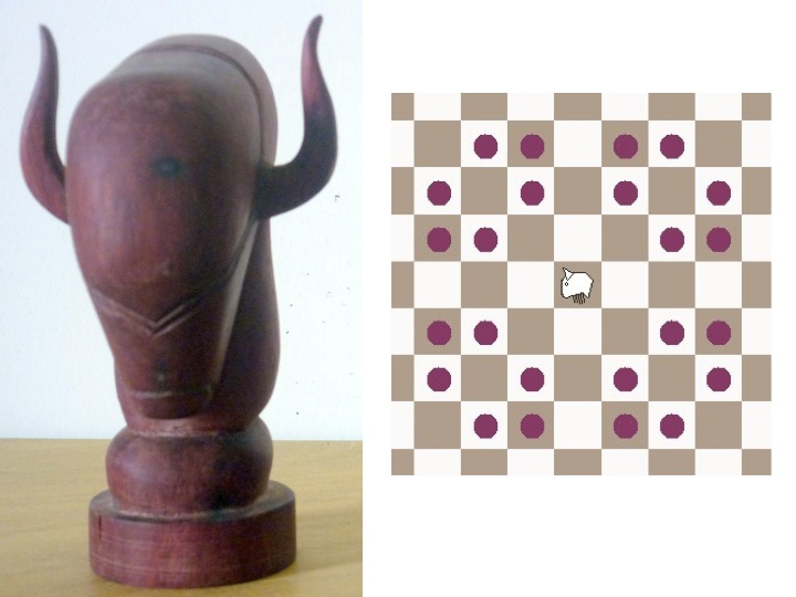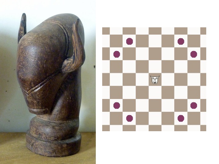 - Taureau (1): il saute vers la case opposée d'un rectangle de 3x4, comme un Cavalier "amélioré". Il est à noter qu'il change de couleur de case à chacun de ses sauts.