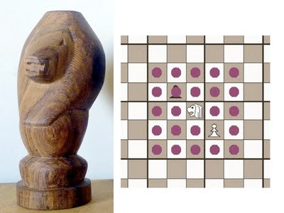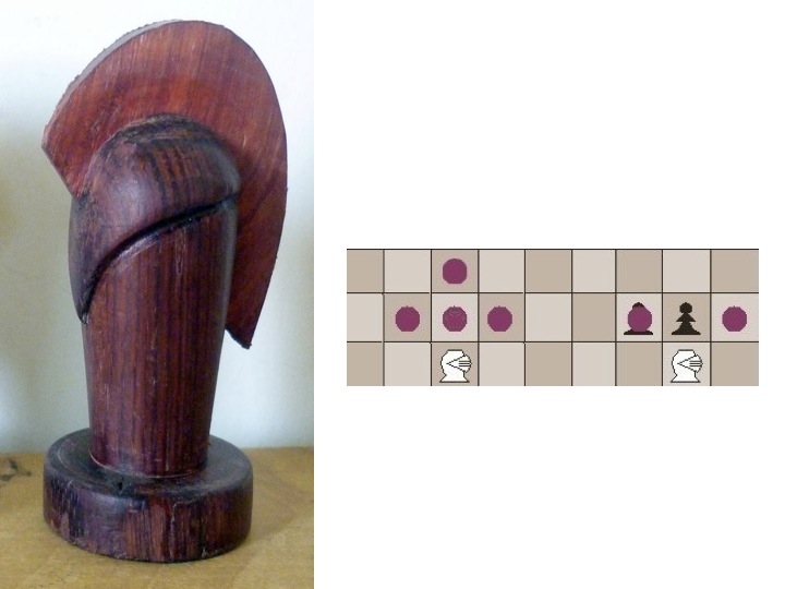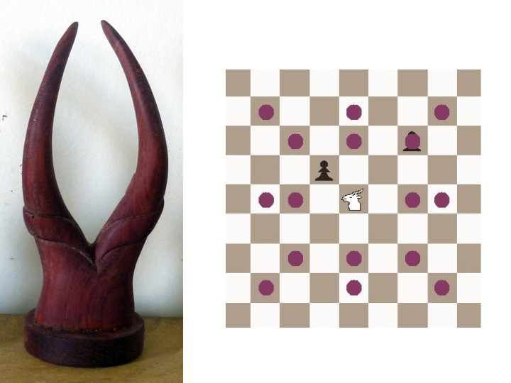 - Antilope (1) : elle saute de deux ou de trois cases orthogonalement ou diagonalement en enjambant les pièces intermédiaires.