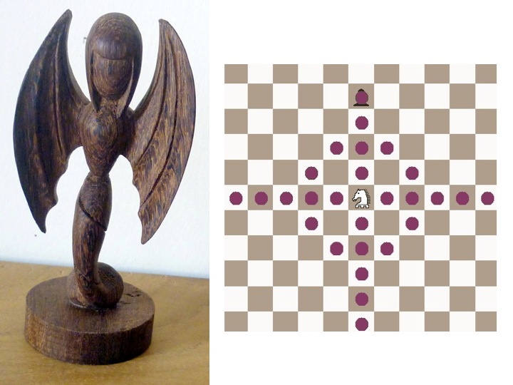 - Griffon (1) :il avance d'abord d'une case diagonalement puis il glisse d'un nombre indéfini de cases verticalement ou horizontalement. Il peut aussi simplement d'avancer d'une case en diagonal seulement. Le Griffon ne peut pas sauter et le mouvement diagonal doit commencer à partir d'une case non obstruée. Cette pièce est presqu'aussi puissante que la Reine.