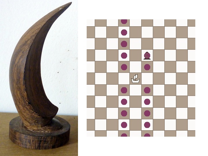 - Bateau (2) : il avance d'abord d'une case en diagonal et puis il glisse d'un nombre indéfini de cases verticalement, mais jamais horizontalement. Il ne peut jamais sauter par-dessus une autre pièce et il doit commencer son mouvement par une diagonale. Un Bateau ayant atteint une des extrémités opposées de adversaire peut être promu en Griffon.