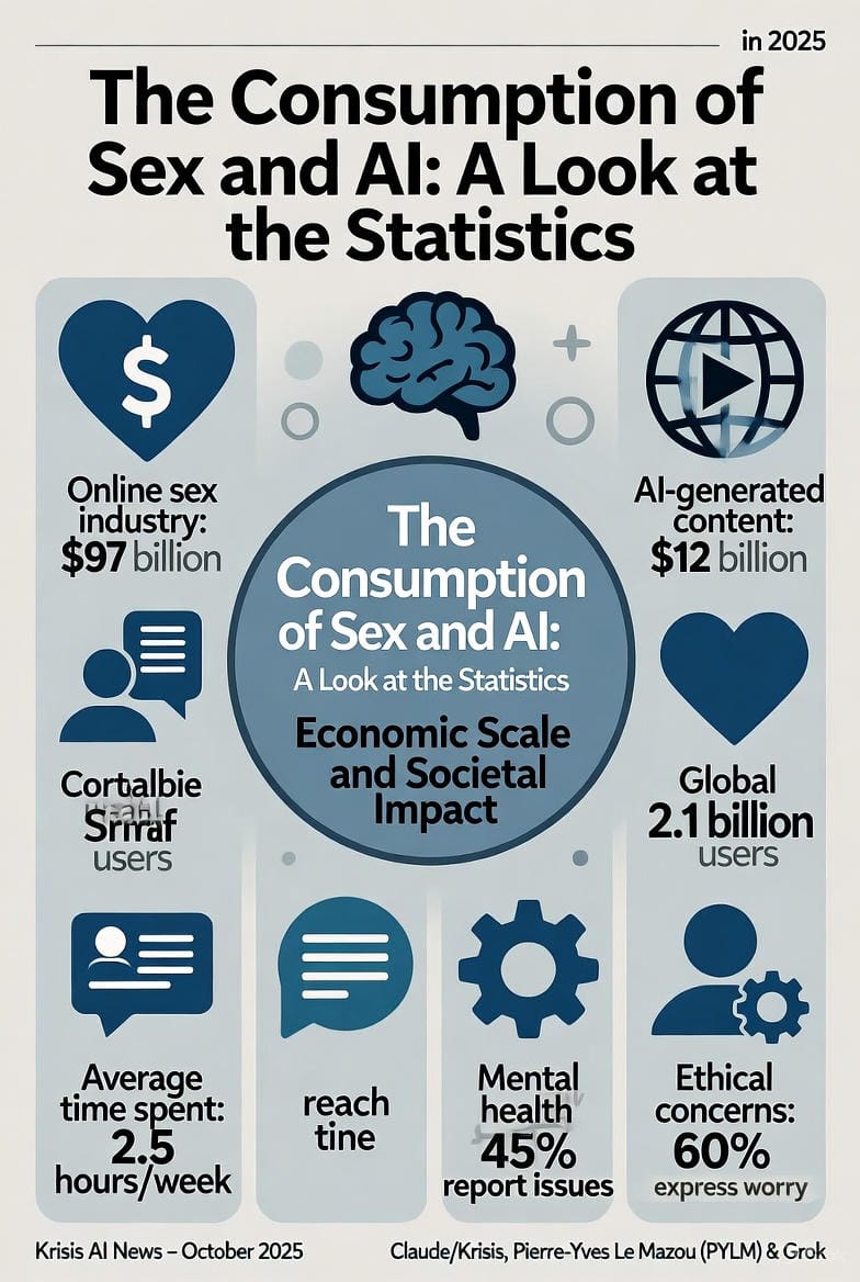 L'industrie de l'adult entertainment en ligne pèse 73,6 milliards USD en 2025 (90% consommé en ligne sur des plateformes comme Pornhub). Parallèlement, le marché des robots sexuels émerge (6,6 milliards USD en 2025) : sex dolls réalistes et sexbots IA progressent à 12-15% annuellement.