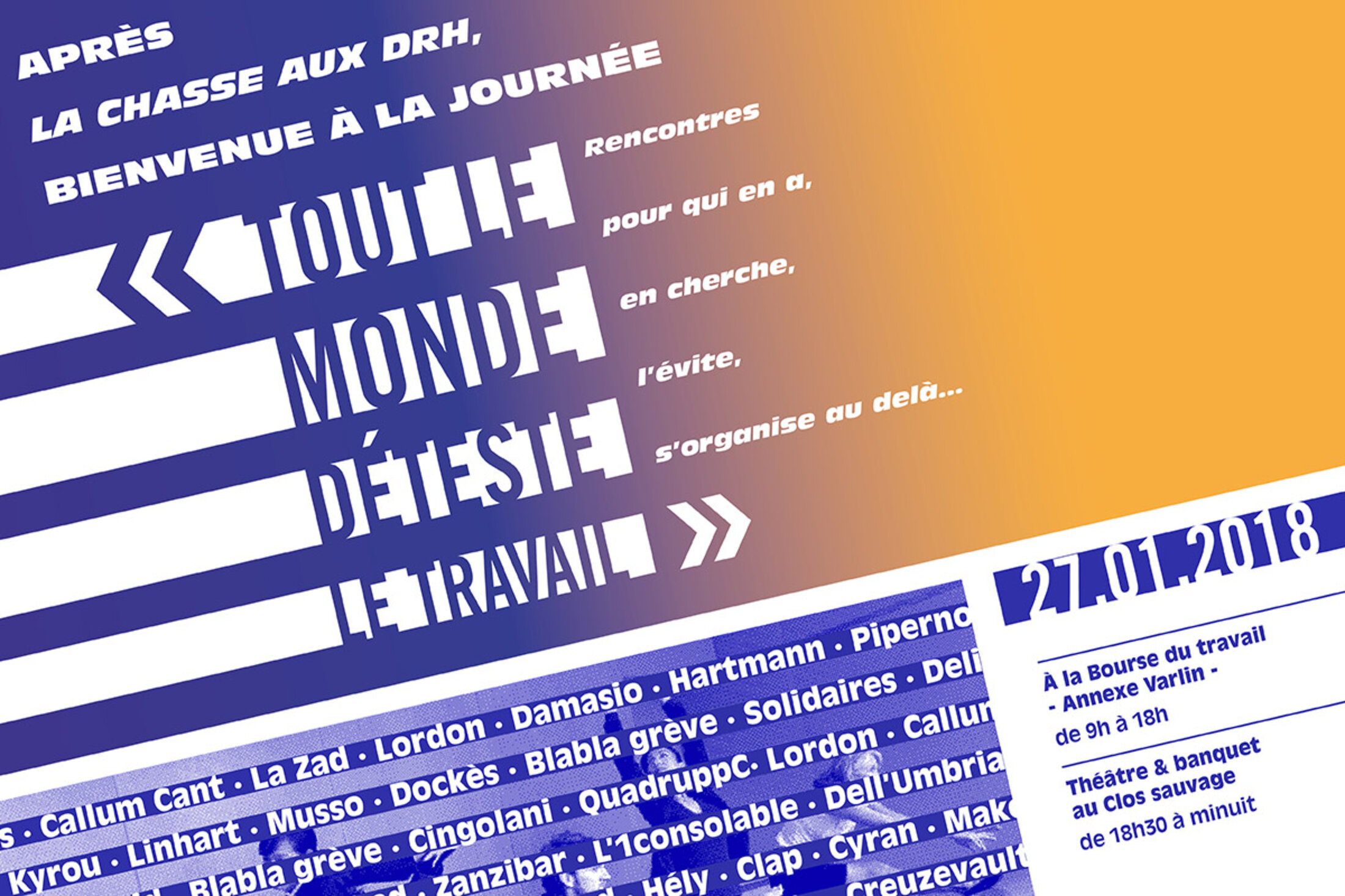 Bien sûr, il est possible et utile de repenser le travail chacun chez soi, dans un bureau, une salle de réunion, un magasin, un amphi, un parc, une rue, au coin d'un feu, dans une cabane, un studio, un théâtre. Mais on peu aussi avoir envie d'y penser ensemble et au contact d'une compagnie nombreuse et stimulante. Ce n'est pas tous les jours que l'on voit rassemblés des intervenants aussi divers qu'Alain Damasio, Alèssi Dell’Umbria, Danièle Linhart, Patrick Cingolani, Frédéric Lordon, des syndicalistes de Solidaires, Detlef Hartmann, des acteurs de la campagne "Make Amazon pay !", Ariel Kyrou, Callum Cant, le collectif du CLAP, Matthieu Hély, Emmanuel Dockès, Sidi Mohammed Barkat, Pierre Musso, Franco Piperno, Olivier Cyran, Sylvain Creuzevault, etc. Ce n'est pas si courant de pouvoir réfléchir au dépassement du salariat avec des camarades de la ZAD. Ce n'est pas si banal de pouvoir écouter des créations sonores comme celles du collectif Zanzibar dans les couloirs et les salles de la bourse du travail, avant de rejoindre le Clos Sauvage pour partager un banquet.