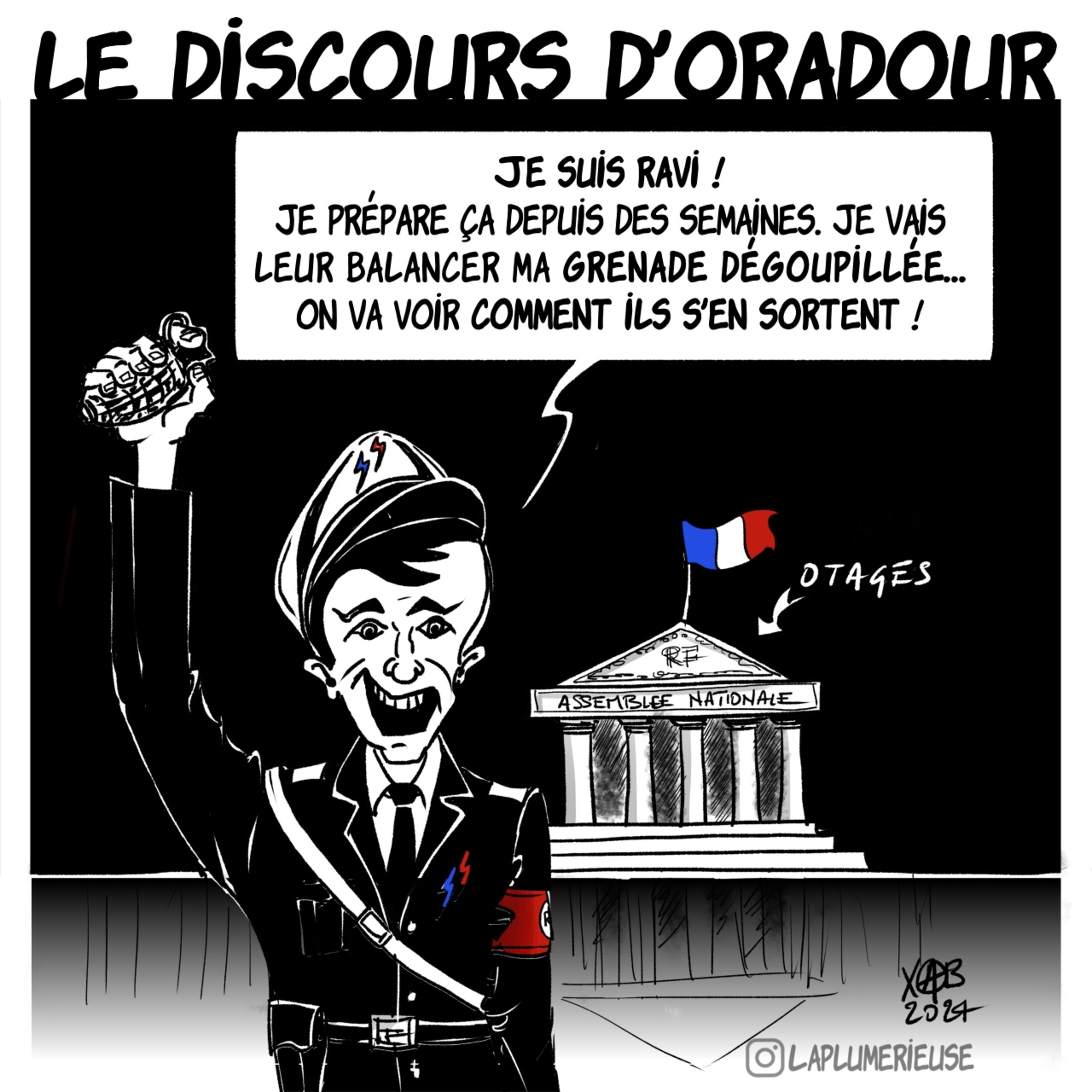 Le discours de Macron à Oradour en dit long sur le vil personnage / Ravi : d’ouvrir les portes au FN après une longue préparation / Grenade : fascination pour les armes mutilantes, celles-là même qui ont éborgnés les gilets jaunes ou les militants de Sainte-Soline. Plaisir de faire souffrir / On va voir comment ils s’en sortent : Vous ne m’aimez pas, je vous colle dans la mouise, démerdez vous.