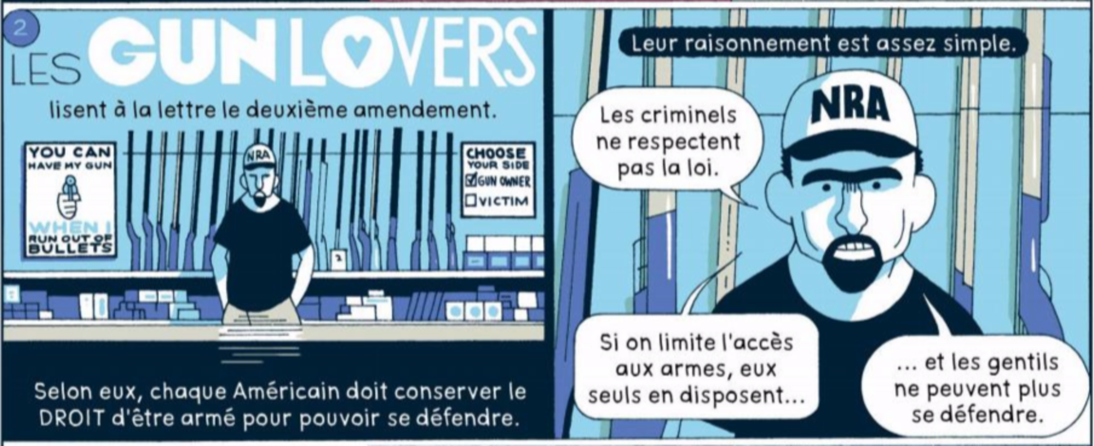 Dans ce pays où posséder un pistolet est un droit fondamental et où l’on compte 357 millions d’armes à feu pour 321,1 millions d’habitants, réglementer le port d’arme est une gageure. L'ancien président, Barack Obama s'y est bien essayé, mais il a très vite buté sur la puissante NRA, le lobby des armes. C'est ce parcours du combattant que racontent Guillemette Faure et Benjamin Adam dans la revue TOPO, la petite soeur de La Revue Dessinée ( destinée aux moins de 20 ans, mais pas seulement ). Pour comprendre les raisons du blocage, on vous offre leur nécessaire décryptage en bande dessinée, en intégralité. C'est ici :