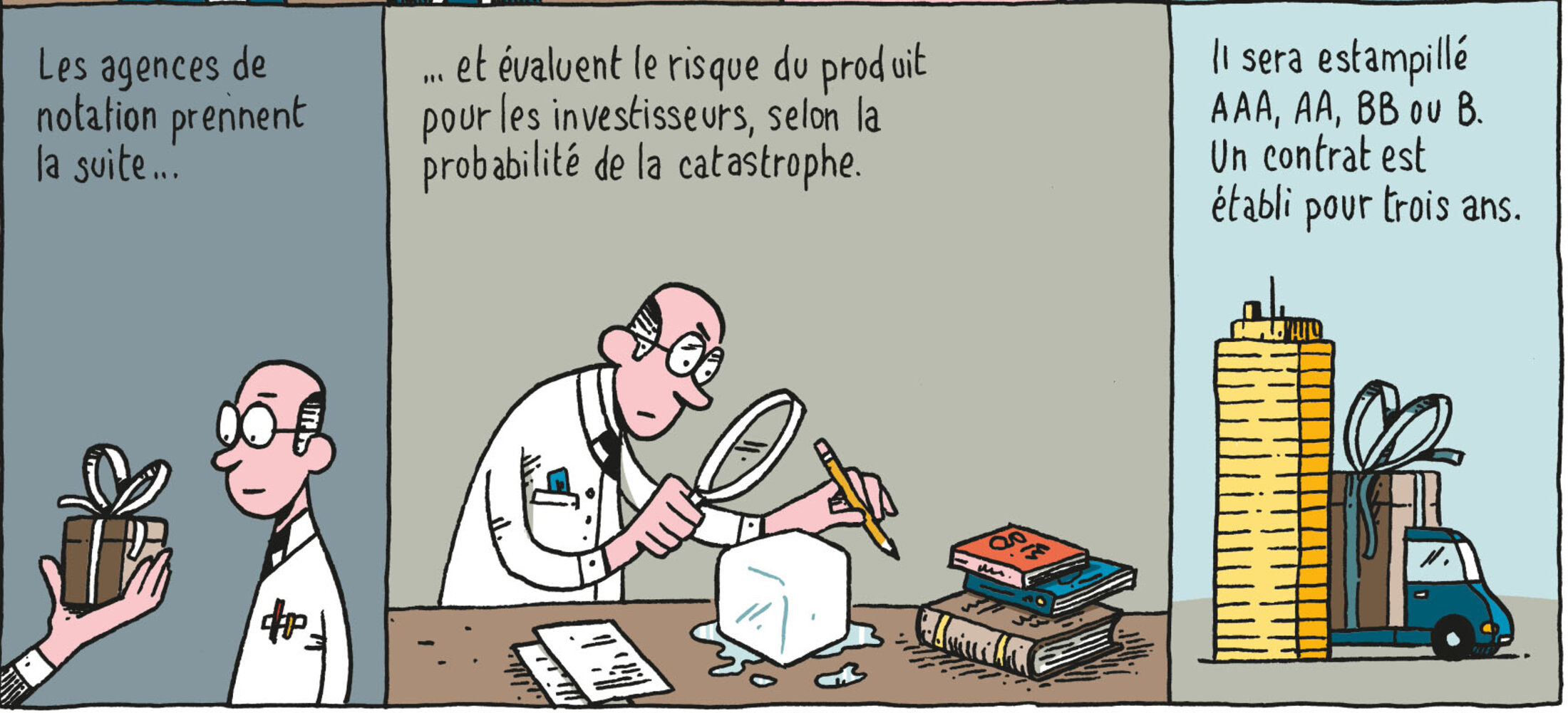 Énoncé par Ulrich Beck dès 1986 dans un essai La Société du risque : sur la voie d’une autre modernité, cette pensée se concrétise avec la création des fameuses obligations catastrophes au milieu des années 1990. Ce nouvel instrument financier, qui semble répondre aux effets du réchauffement climatique, connaît très vite un immense succès. Il permet aux assureurs de mutualiser les pertes, sans pour autant renoncer à la privatisation des bénéfices. Aux nations, il offre l'immense avantage de réduire l'état d'incertitude environnementale. Car le xxie siècle apparaît bien comme celui des crises de la nature, crises qui affectent durement le capitalisme et le rôle de régulateur de l'État. Problème : cette « assurance-nature » n'est pas fiable à 100%. Elle peut même parfois se retourner contre ceux qui l'ont souscrite. Sous le dessin de Pierre Lecrenier, l’enquête de Carol Suhas, journaliste indépendante, soulève une tempête de questions.