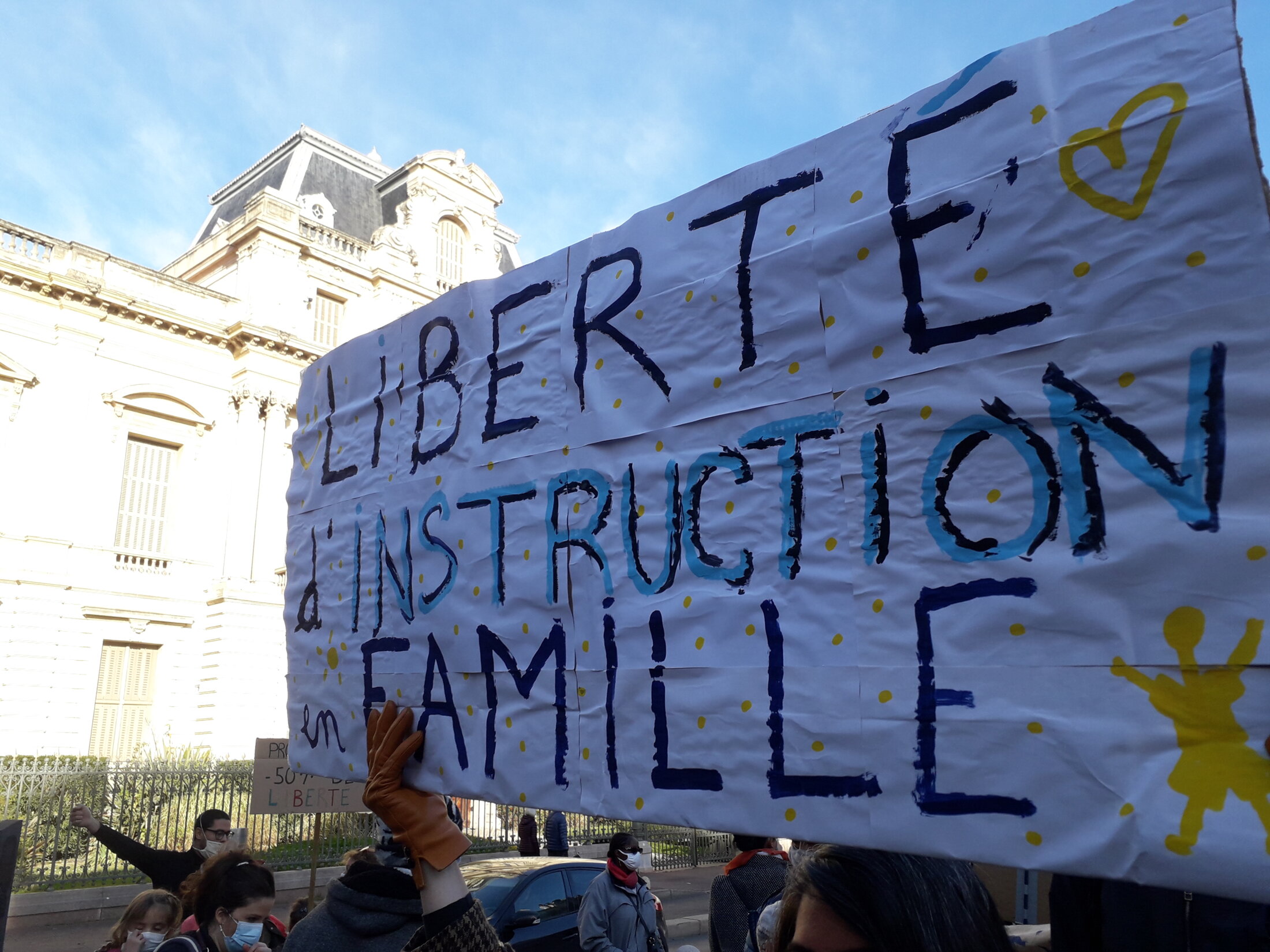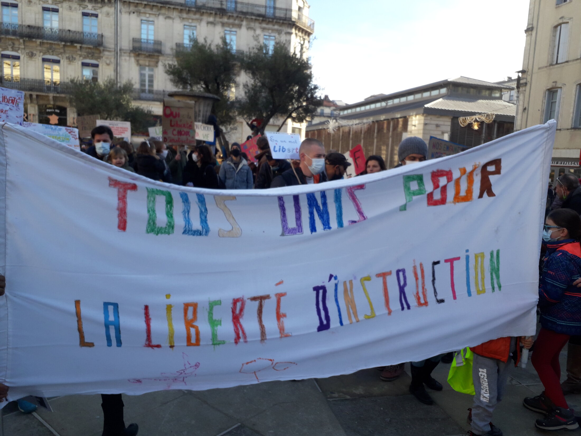 Samedi 5 décembre 2020, en début d'après-midi. Sous les fenêtres de la Préfecture de l'Hérault et la caresse douce du soleil, une demi douzaine d'enfants s'affairent, feutres en main, autour d'une banderole posée à même le sol, entourés des regards bienveillants ou curieux de quelques dizaines d'autres et de leurs parents. Les mains appliquées colorient les lettres d'un slogan : "Tous unis pour la liberté d'instruction".