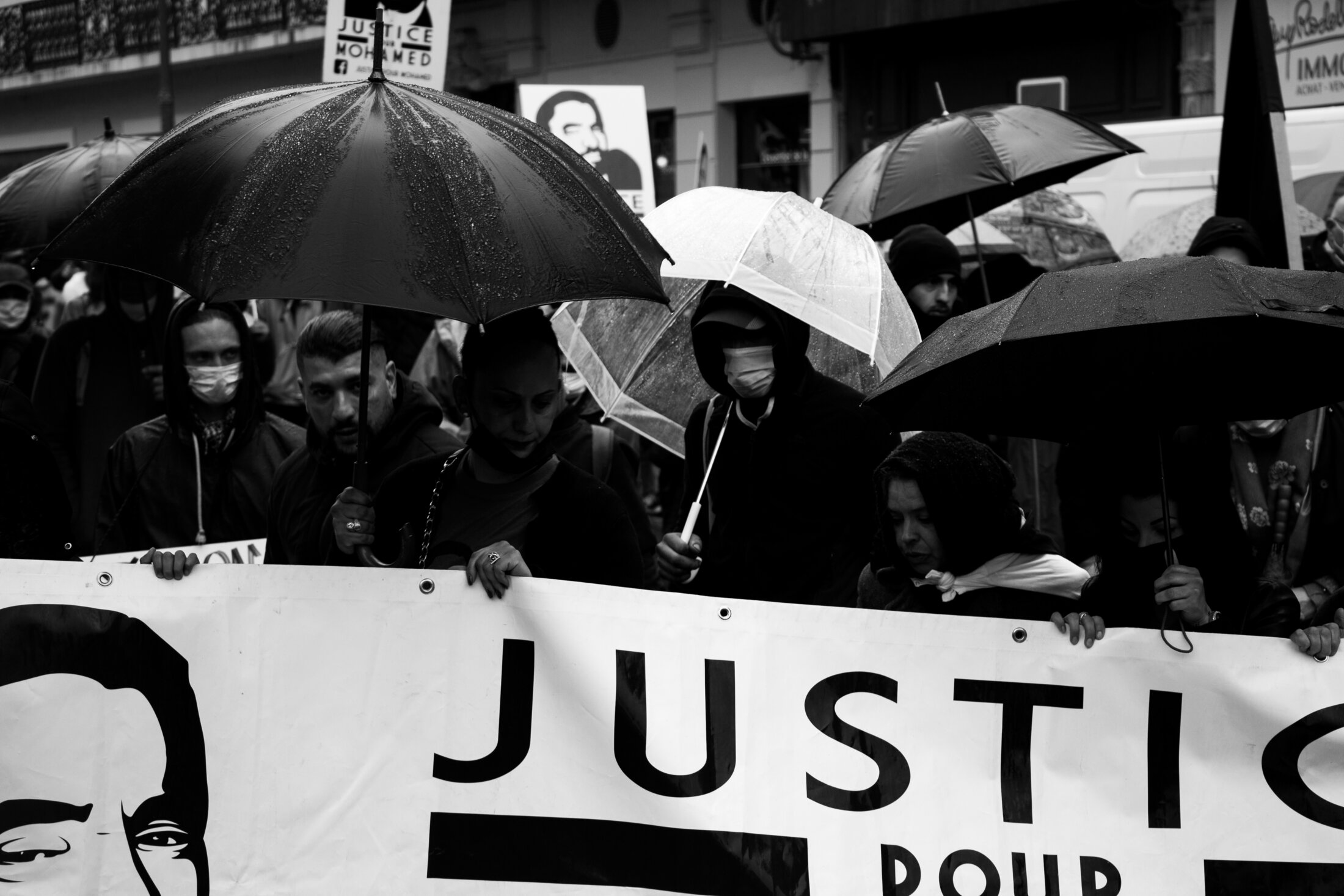 Aujourd’hui, un an est passé depuis la mort de Mohamed Gabsi, et il pleuvait à Béziers, comme partout. Plus d’un millier de personnes avaient participé à la première marche du comité en juin dernier, et scandé tout le long du cortège « Justice pour Mohamed ! Justice pour Mohamed ! ». La colère sainement humaine face à l’injustice, elle était toujours là ce samedi 10 avril 2021 malgré la pluie froide et englobante, parmi les quelques deux cents braves venu·es défier les éléments, sous les regards policiers de l’escorte, rares spectateurs d’une ville confinée par la météo.