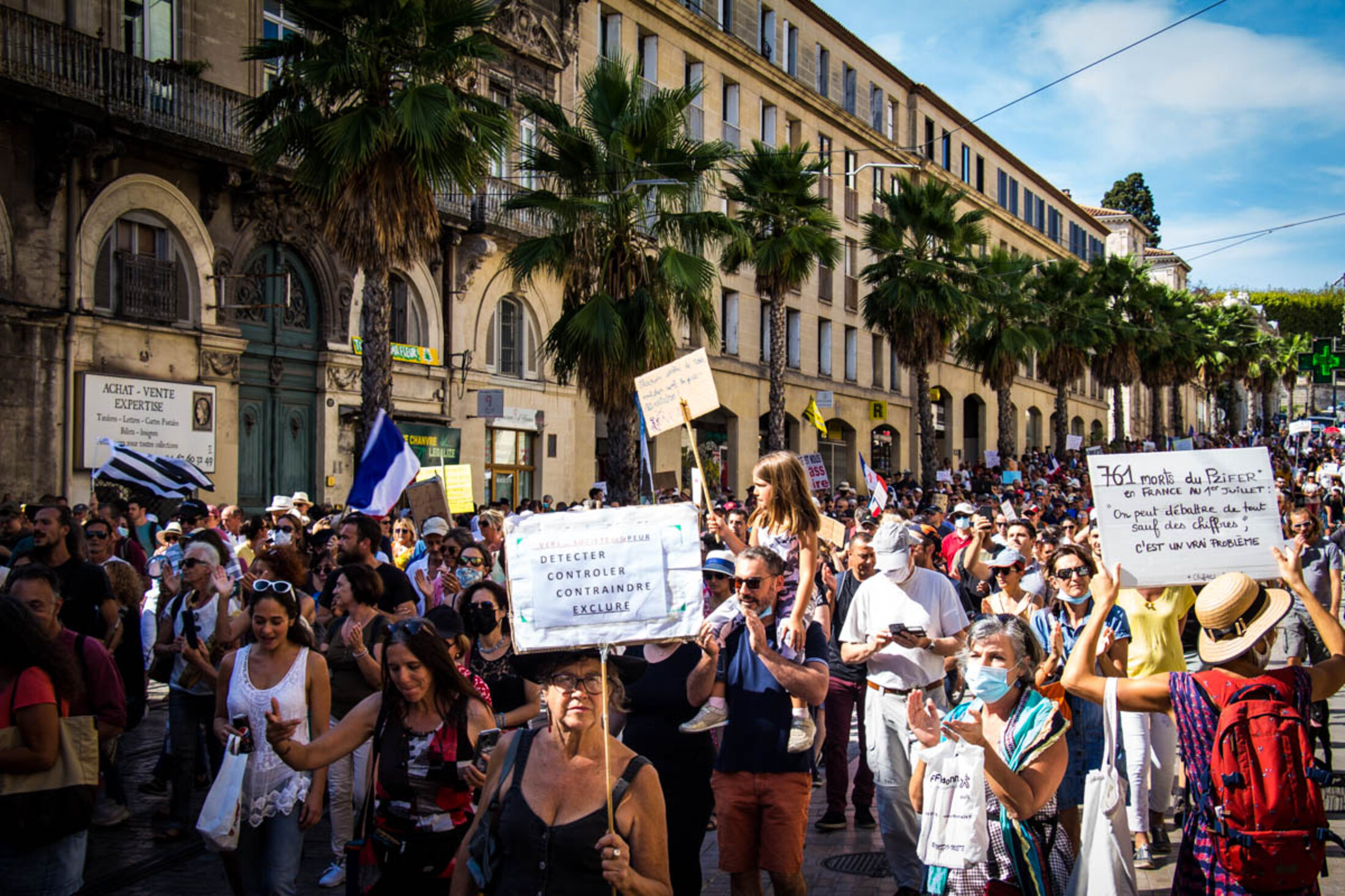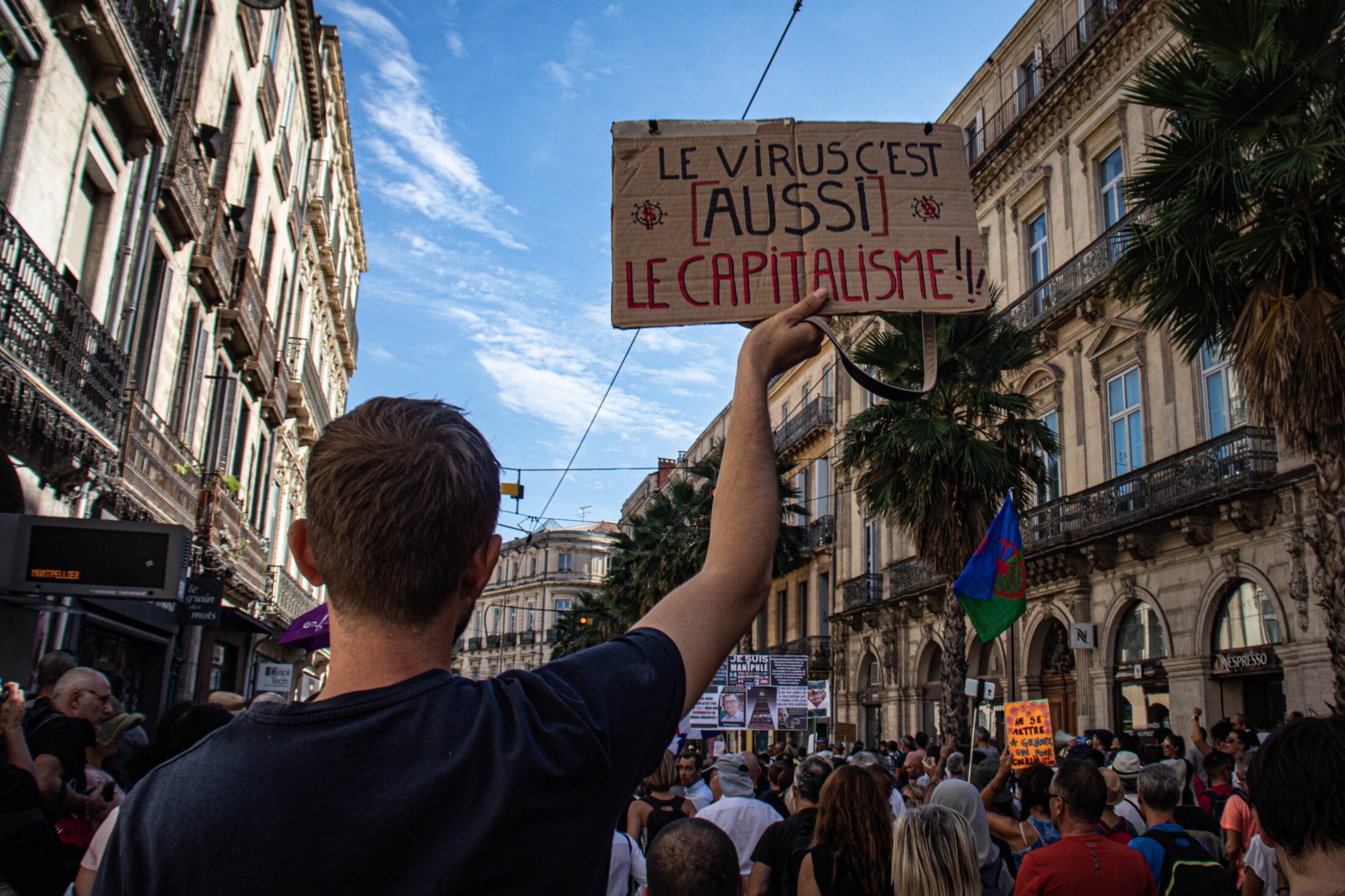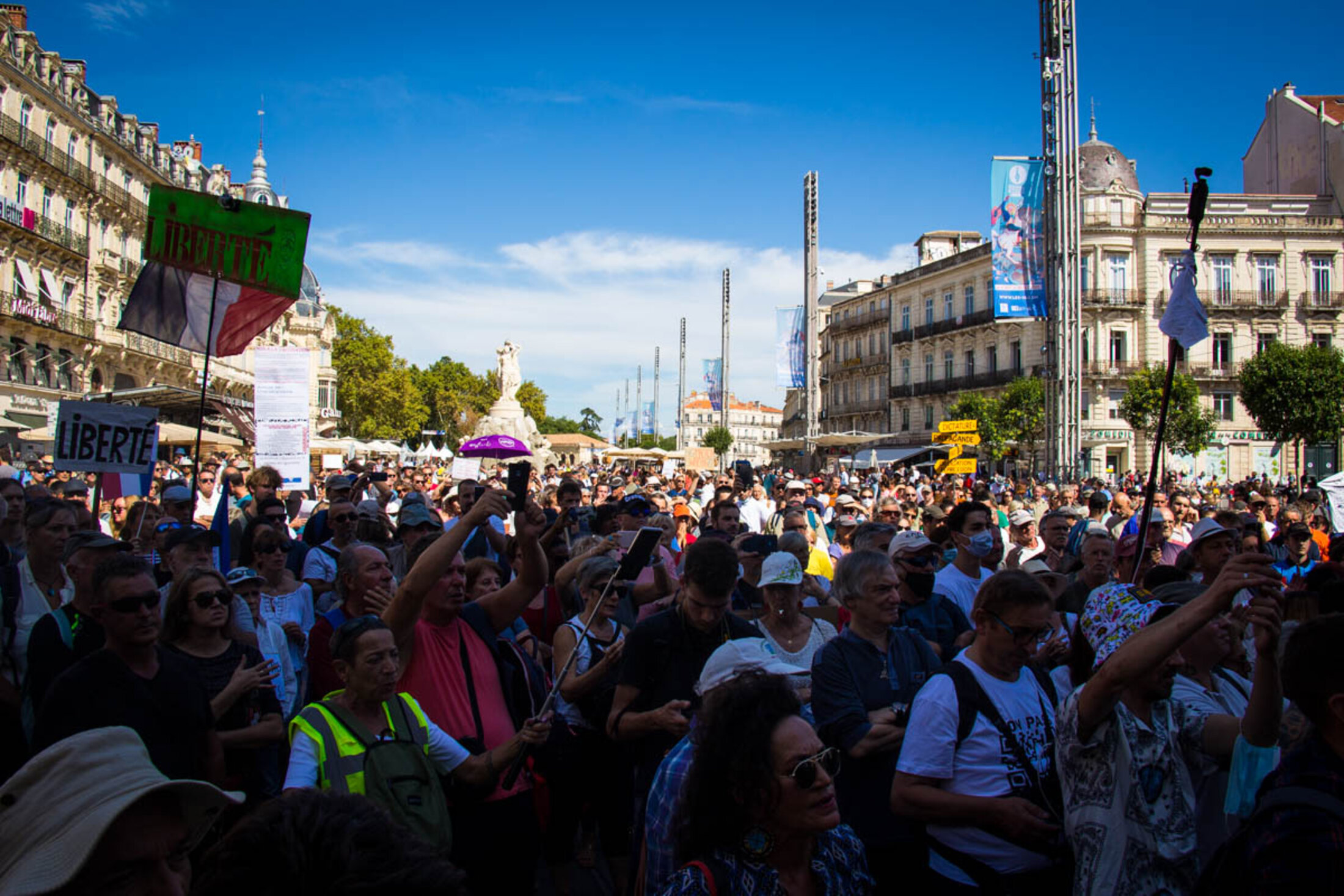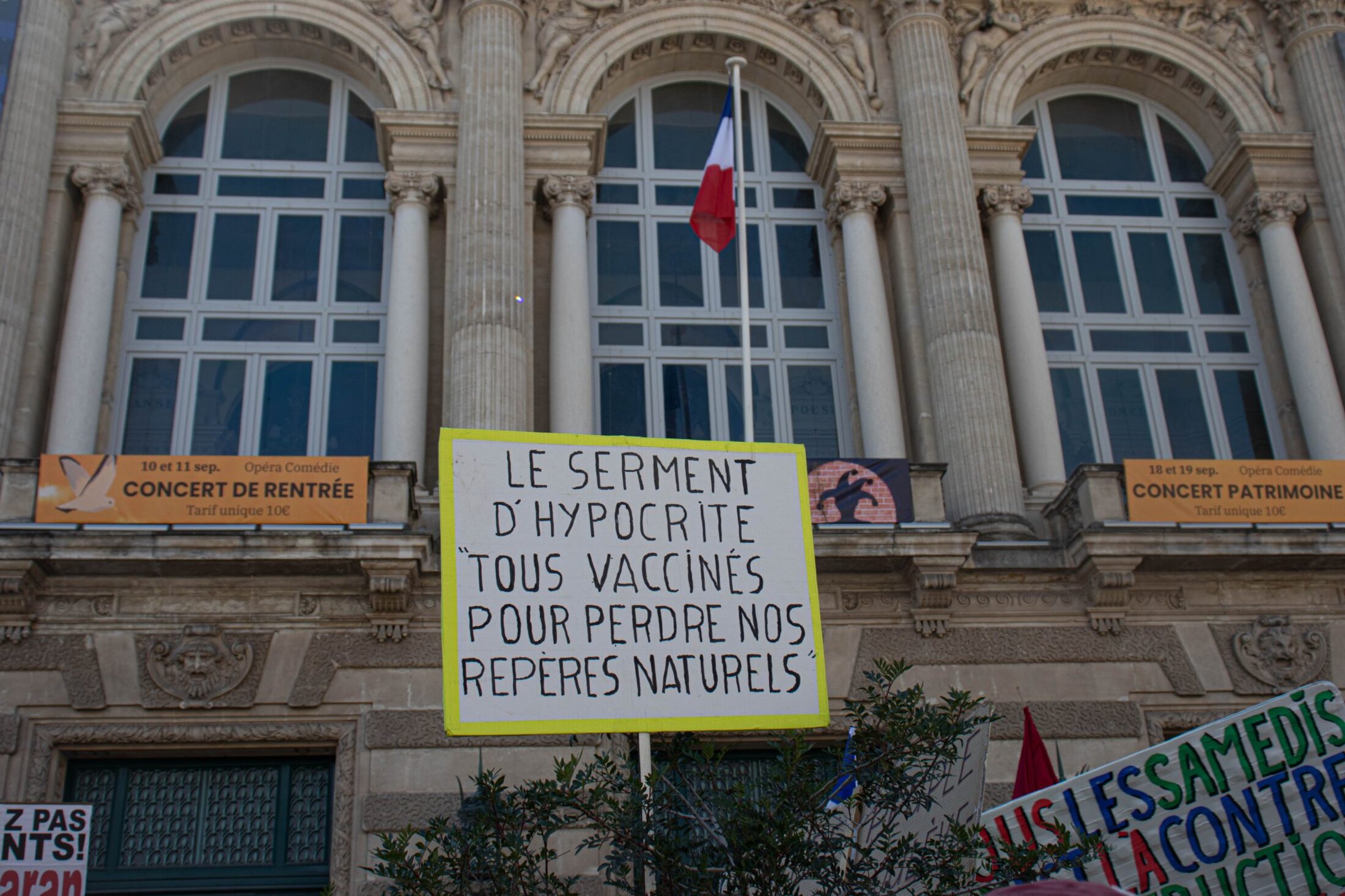 Les samedis se font maintenant routiniers à Montpellier, lors des manifestations du mouvement contre le passe sanitaire. Ce 18 septembre, la mobilisation marquait toutefois un net recul, avec un cortège composé de trois à quatre mille personnes. Le rendez-vous était, comme toujours, donné à 14h sur la place de la Comédie, pour les traditionnelles prises de parole. Mais si les dernières semaines avaient montré un semblant de diversification des discours prononcés, ce samedi n’aura pas laissé place à des revendications d’ordre social ou politique. On y a même assisté à la mise en lumière de nombreuses contre-vérités.