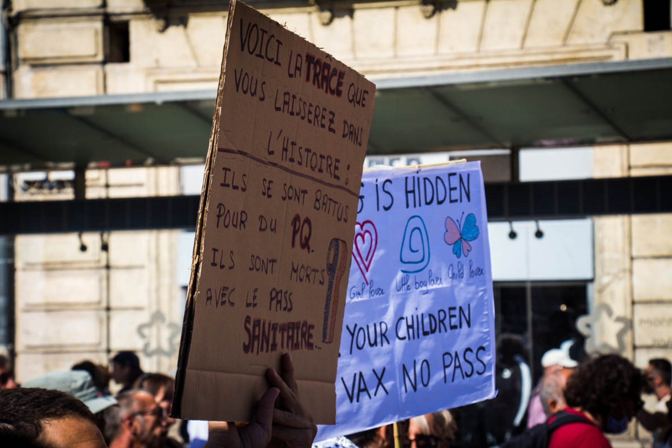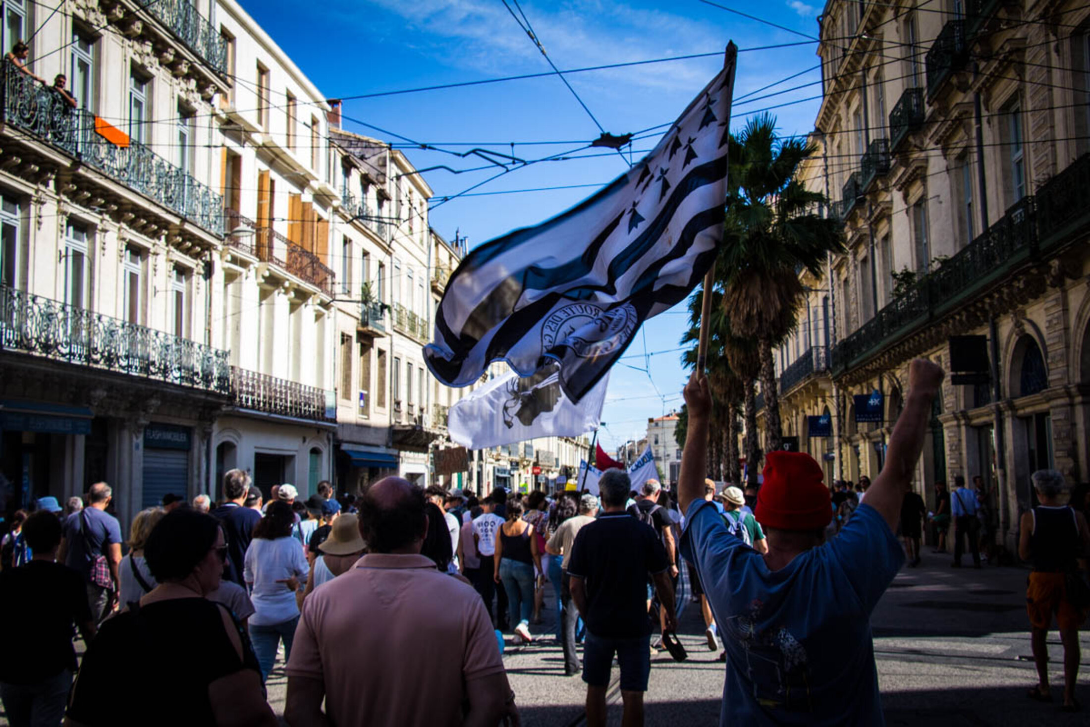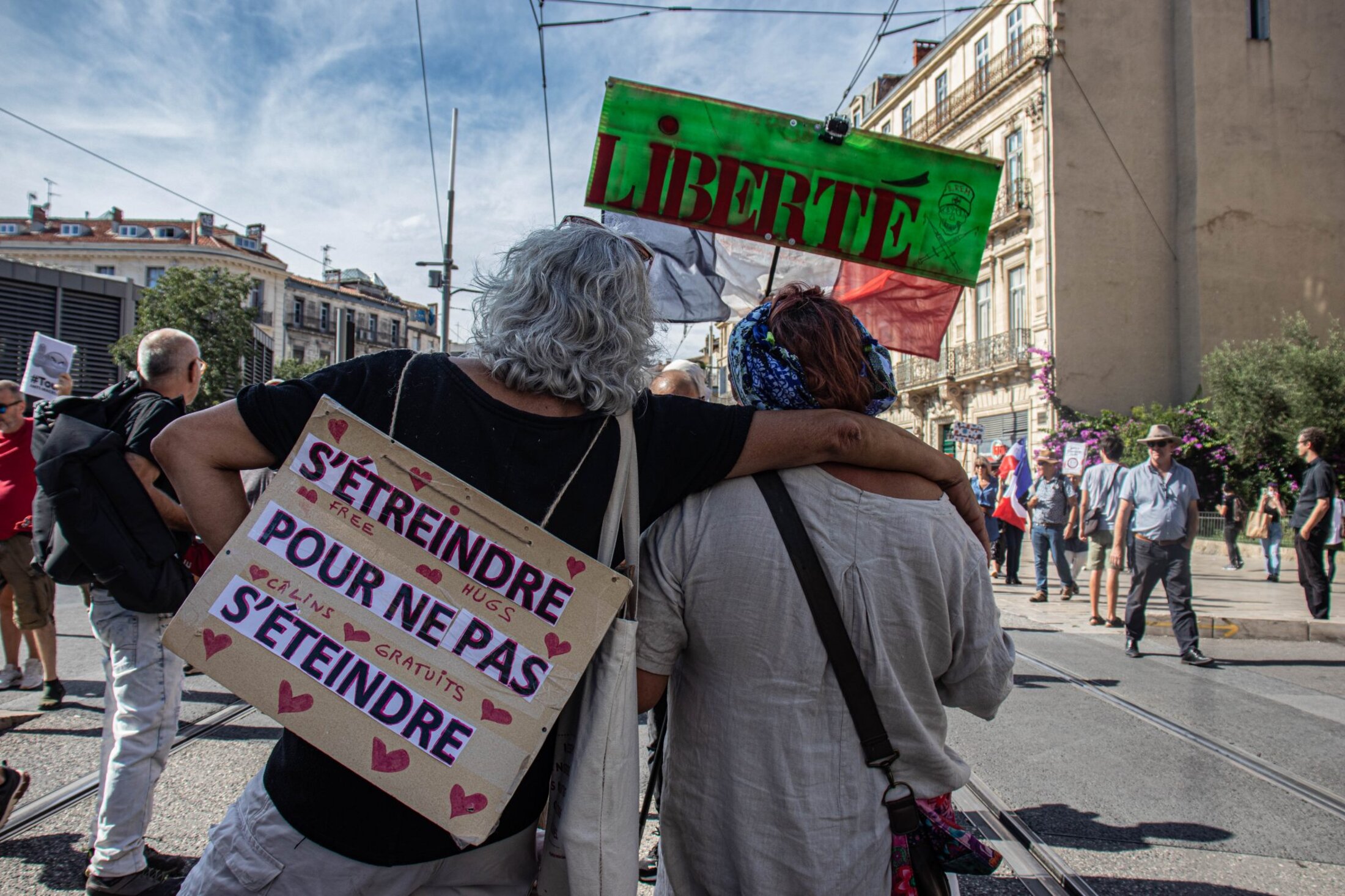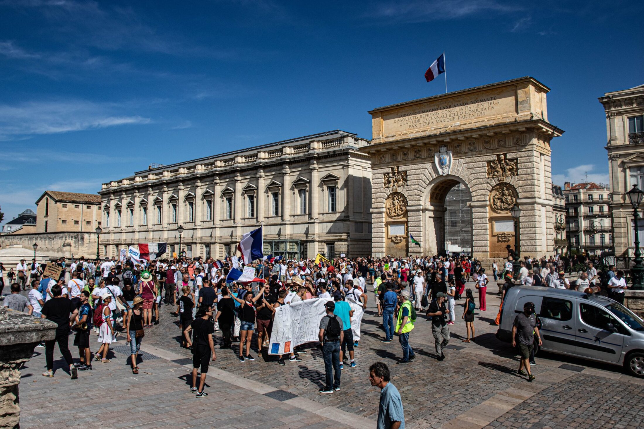 Les samedis se font maintenant routiniers à Montpellier, lors des manifestations du mouvement contre le passe sanitaire. Ce 18 septembre, la mobilisation marquait toutefois un net recul, avec un cortège composé de trois à quatre mille personnes. Le rendez-vous était, comme toujours, donné à 14h sur la place de la Comédie, pour les traditionnelles prises de parole. Mais si les dernières semaines avaient montré un semblant de diversification des discours prononcés, ce samedi n’aura pas laissé place à des revendications d’ordre social ou politique. On y a même assisté à la mise en lumière de nombreuses contre-vérités.