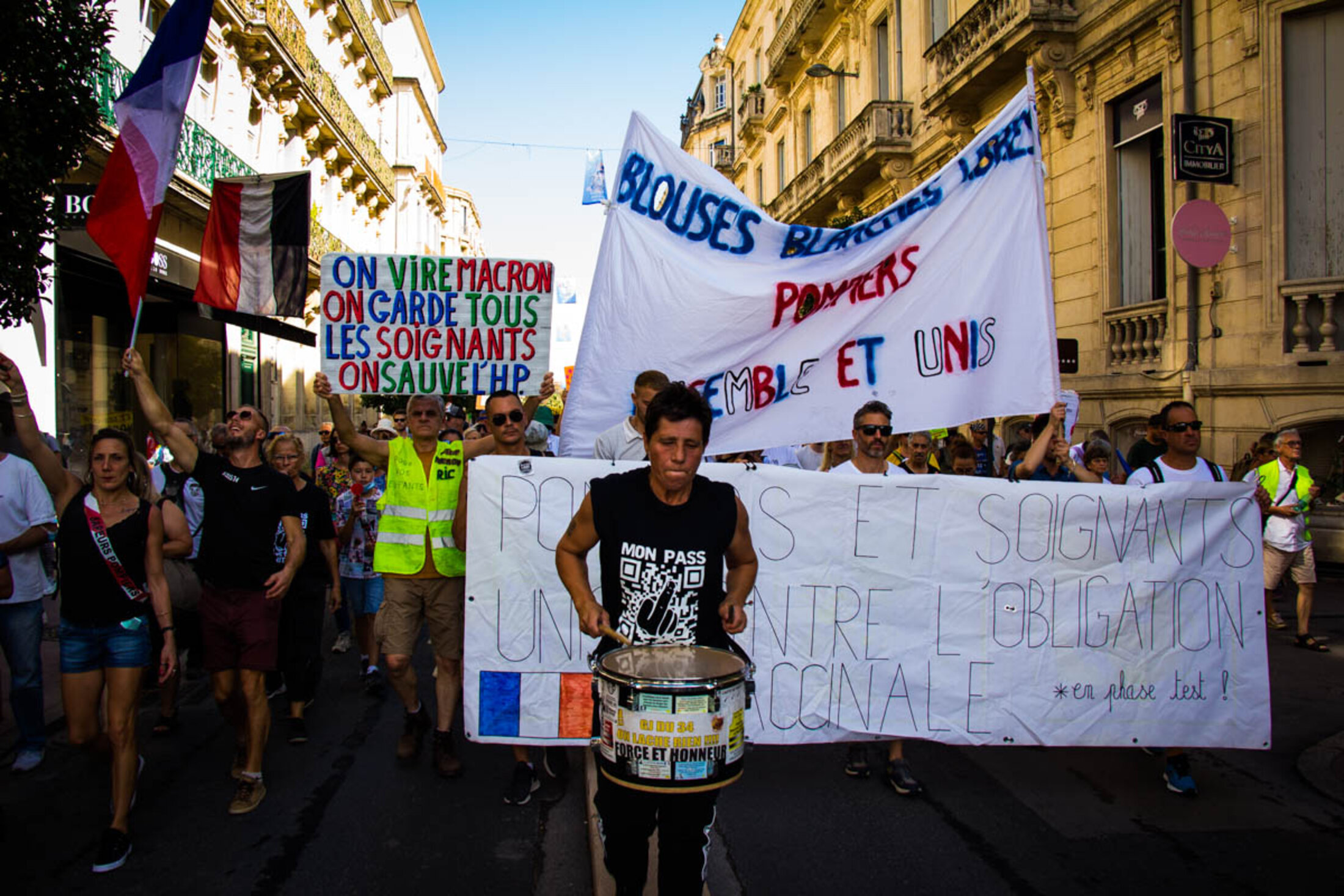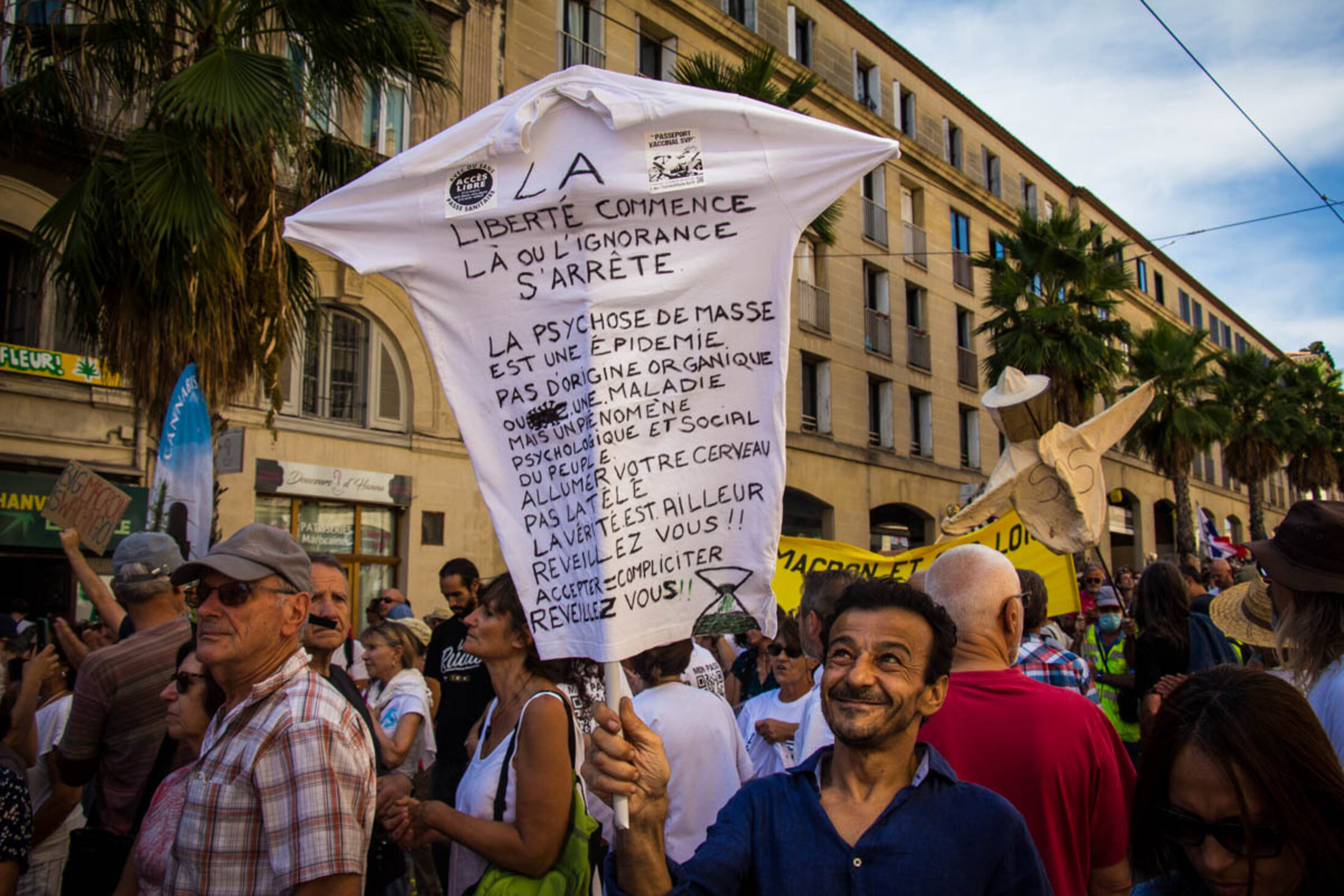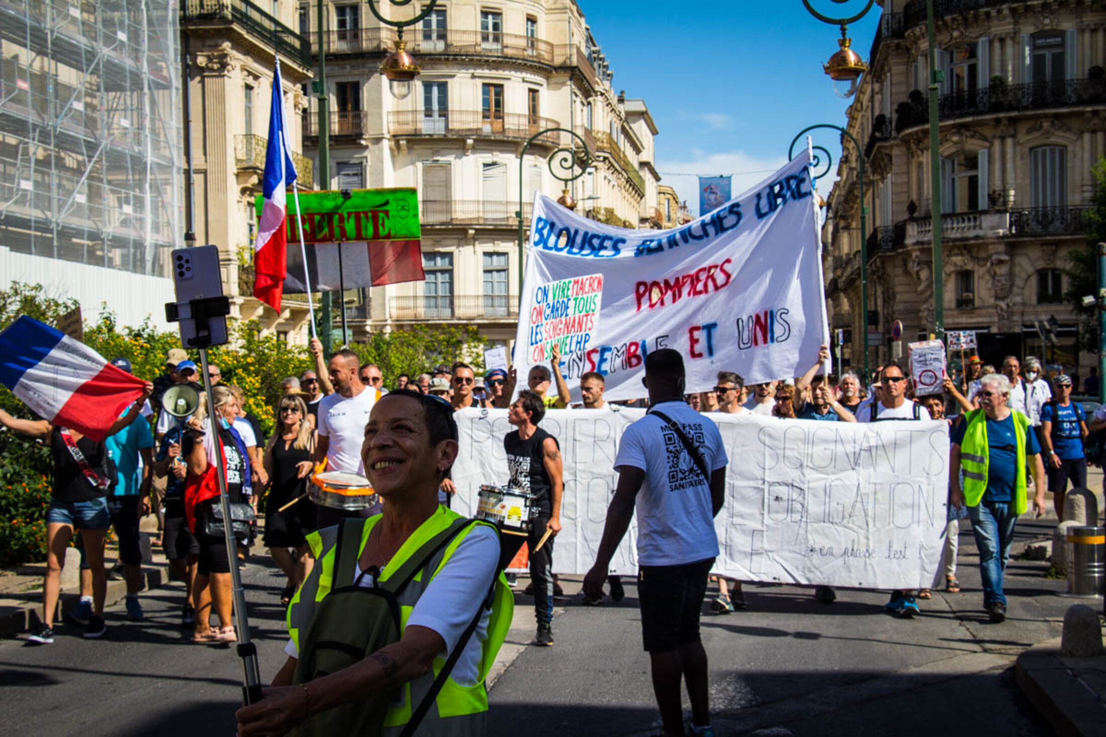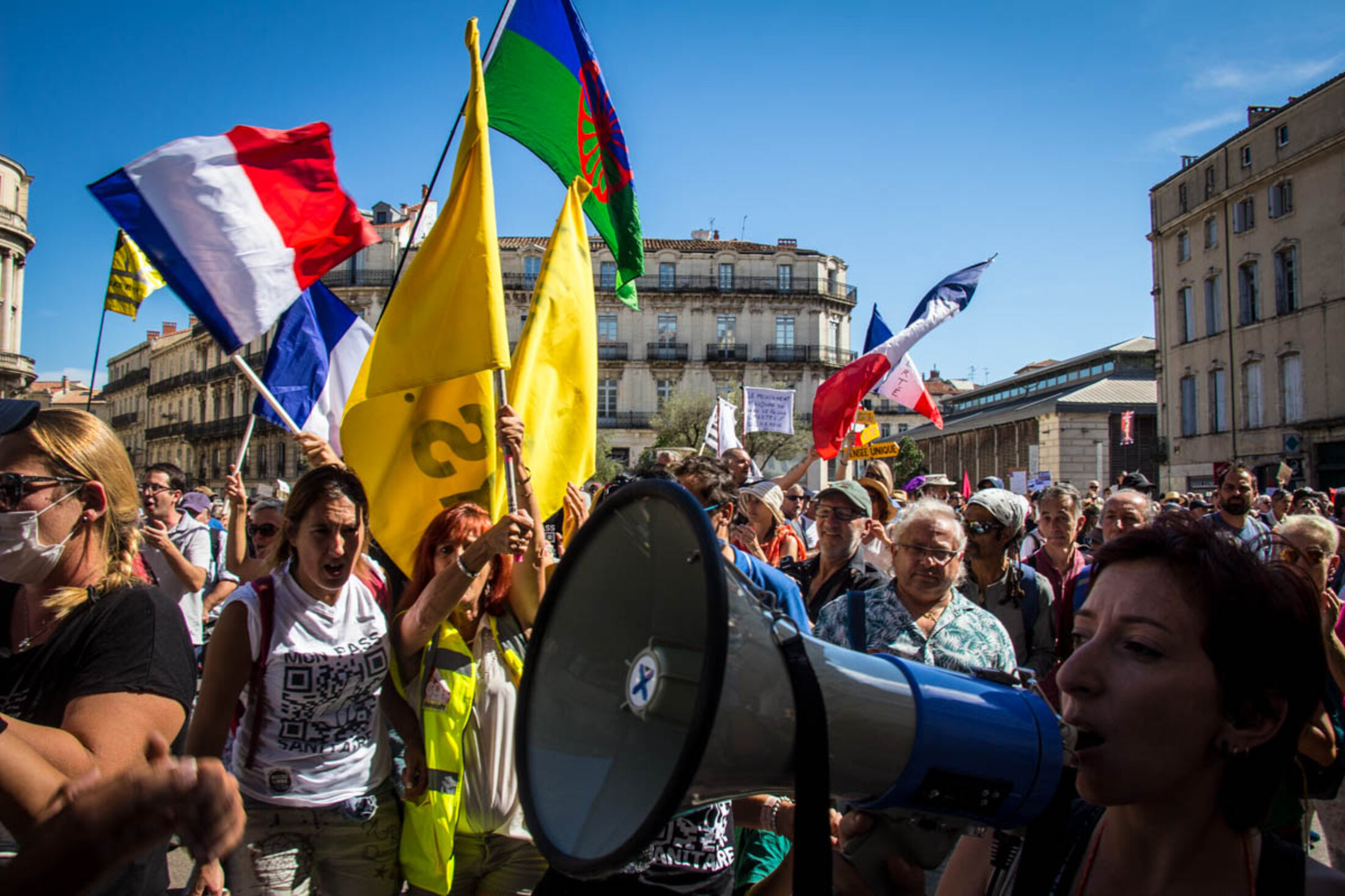 Devant l’écrasant soleil, les organisateurs ouvrent des prises de parole d’abord peu audibles en raison d’un premier matériel défectueux, avant de laisser le micro d’une sono littéralement tonitruante à une soignante exerçant depuis 19 années. Déjà présente les semaines précédentes, elle verra son activité cesser en raison de l’obligation vaccinale à laquelle elle ne compte pas se plier. “Cela a été comme un coup de poignard dans le dos, dénonce-t-elle sous les huées de la foule, avant de se lancer dans une diatribe contre le gouvernement. J’accuse tous les gouvernements français de ne pas avoir entendu les avertissements du corps médical, du personnel soignant qui alertait depuis des décennies sur l’état dramatique des conditions de travail et de soin. J’incrimine tous les gouvernements français d’avoir supprimé des lits, des hôpitaux locaux, entraînant une érosion des soins médicaux dans des territoires de proximité. J’inculpe le gouvernement français d’inaction dès le début de la crise sanitaire, par des actes de gouvernement contraires à notre intérêt général. J’attaque ce gouvernement français pour le manque de matériel de protection, dépistage, et par l’interdiction aux médecins généralistes de prescrire des traitements aux malades.”