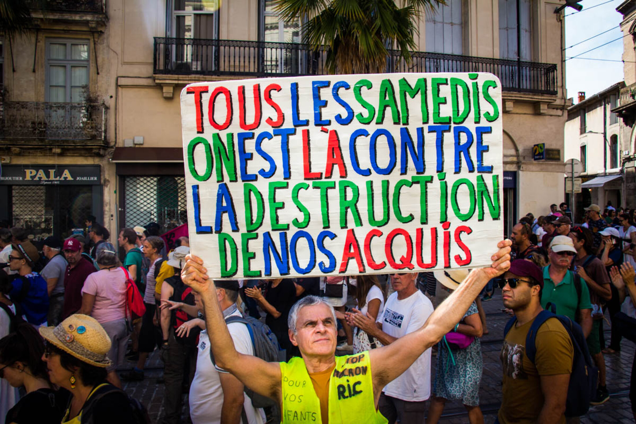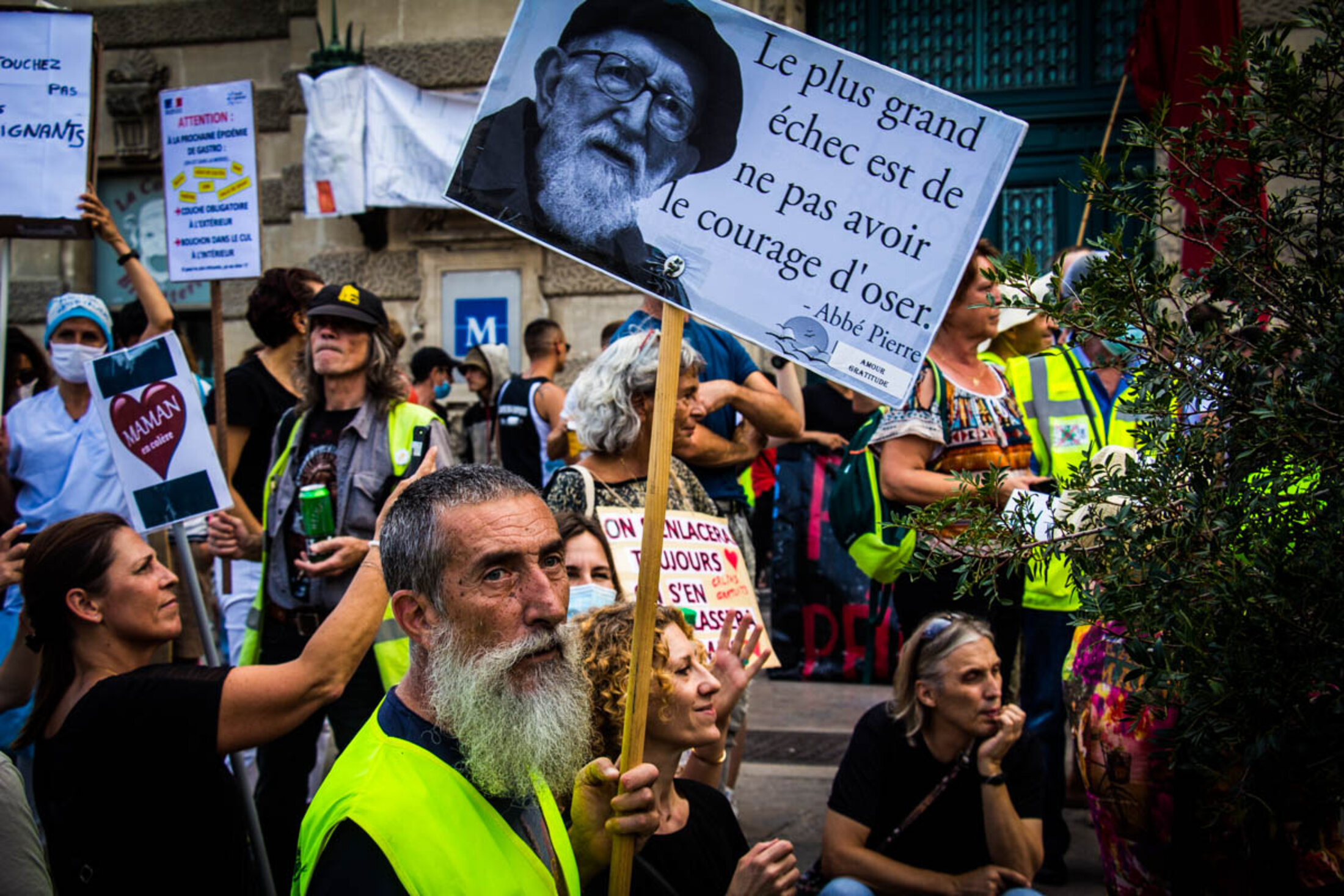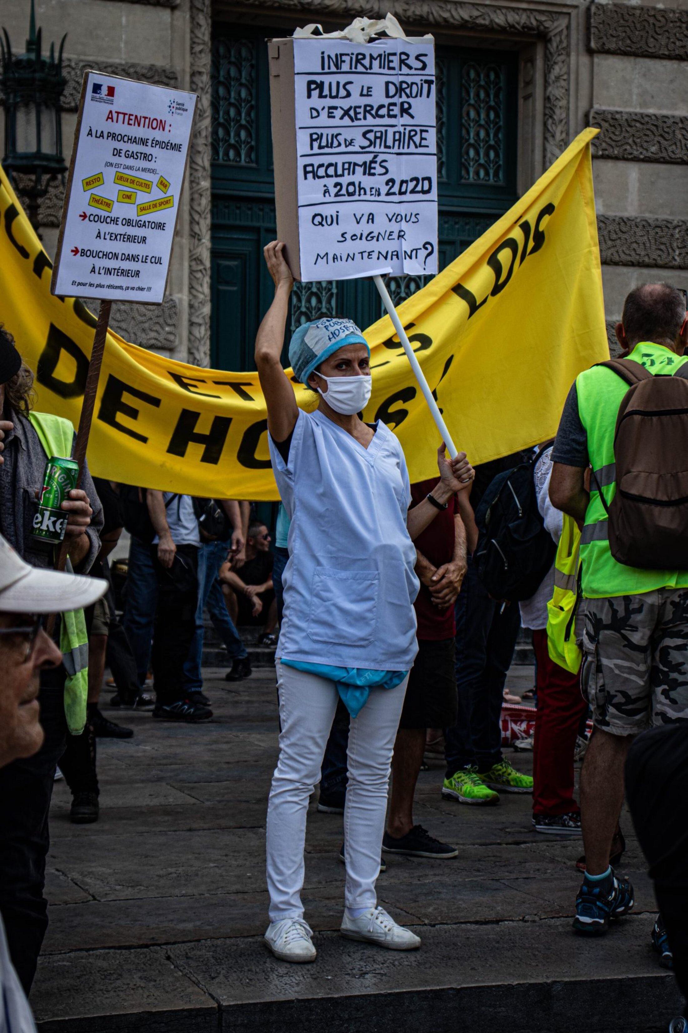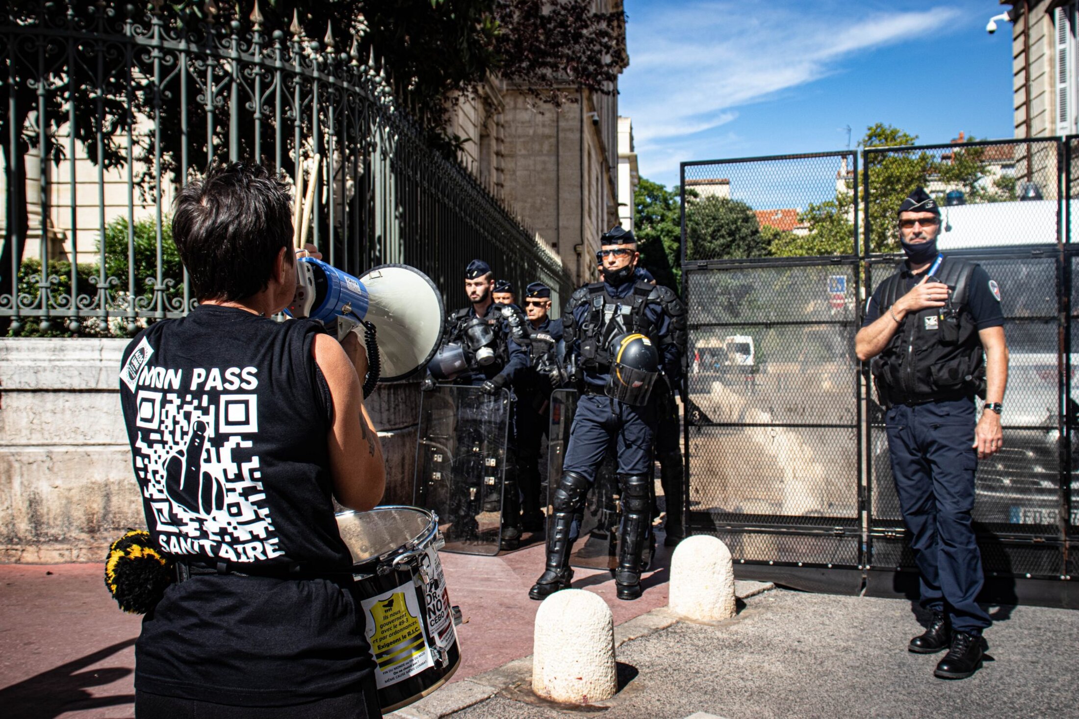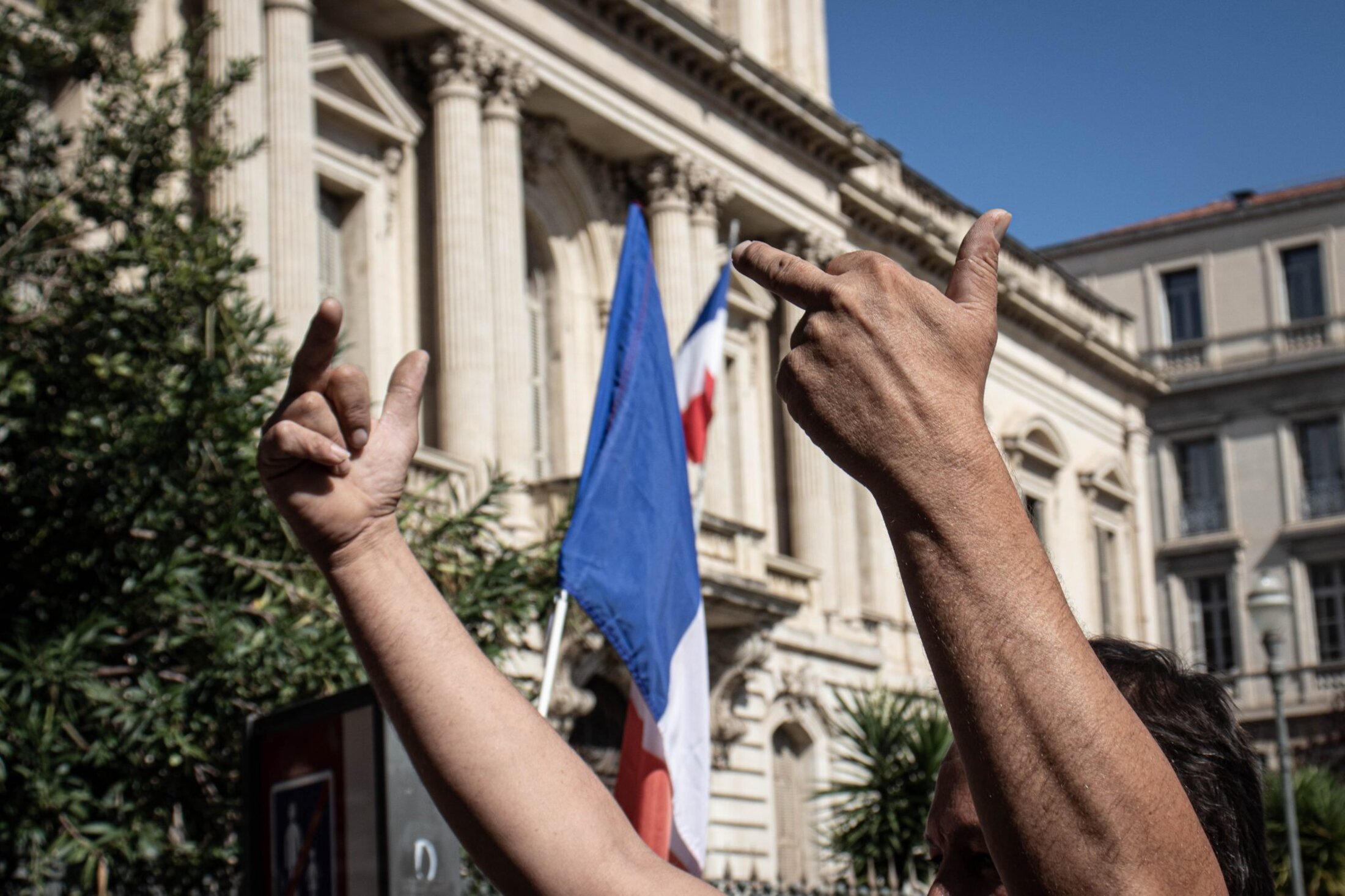 Devant l’écrasant soleil, les organisateurs ouvrent des prises de parole d’abord peu audibles en raison d’un premier matériel défectueux, avant de laisser le micro d’une sono littéralement tonitruante à une soignante exerçant depuis 19 années. Déjà présente les semaines précédentes, elle verra son activité cesser en raison de l’obligation vaccinale à laquelle elle ne compte pas se plier. “Cela a été comme un coup de poignard dans le dos, dénonce-t-elle sous les huées de la foule, avant de se lancer dans une diatribe contre le gouvernement. J’accuse tous les gouvernements français de ne pas avoir entendu les avertissements du corps médical, du personnel soignant qui alertait depuis des décennies sur l’état dramatique des conditions de travail et de soin. J’incrimine tous les gouvernements français d’avoir supprimé des lits, des hôpitaux locaux, entraînant une érosion des soins médicaux dans des territoires de proximité. J’inculpe le gouvernement français d’inaction dès le début de la crise sanitaire, par des actes de gouvernement contraires à notre intérêt général. J’attaque ce gouvernement français pour le manque de matériel de protection, dépistage, et par l’interdiction aux médecins généralistes de prescrire des traitements aux malades.”