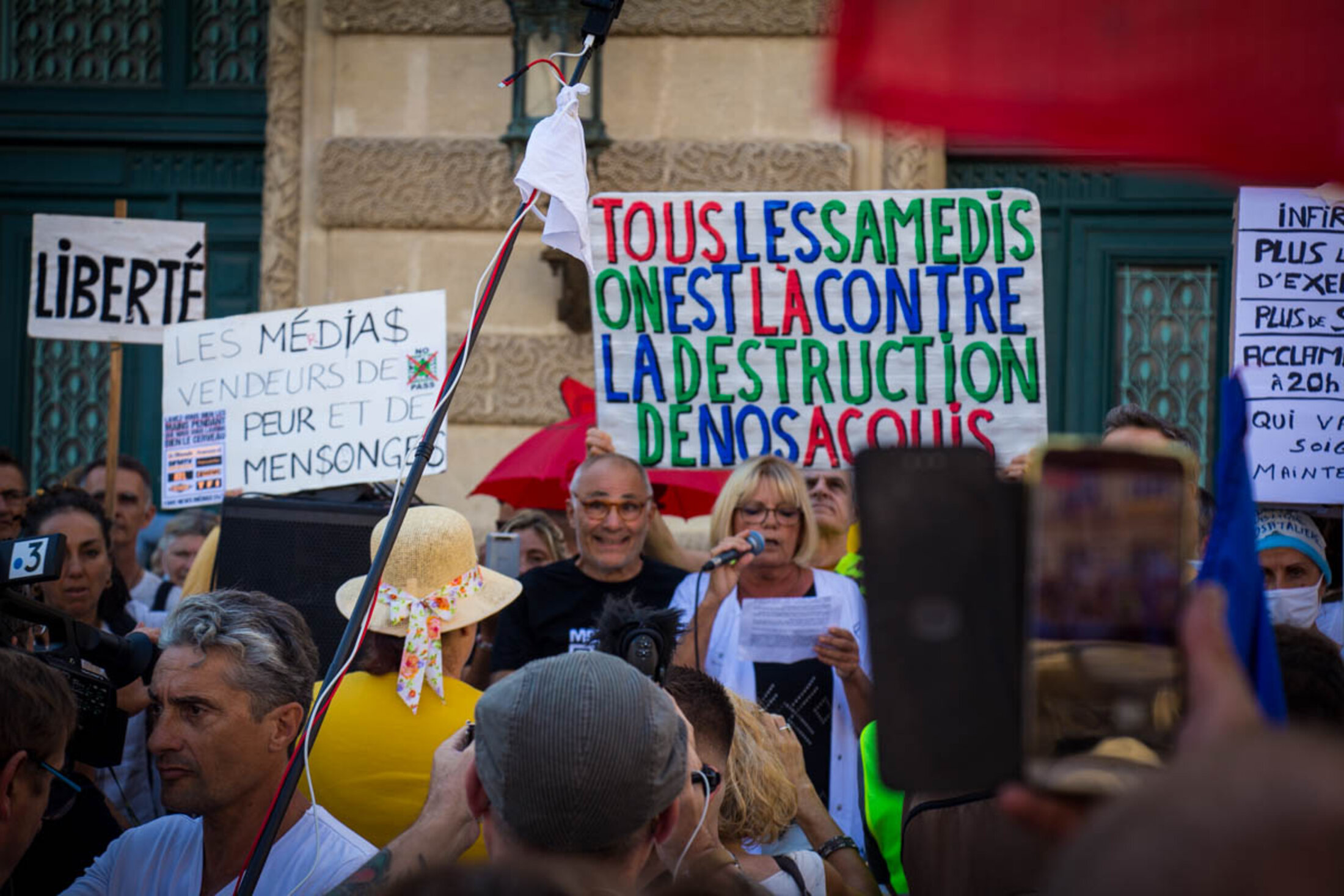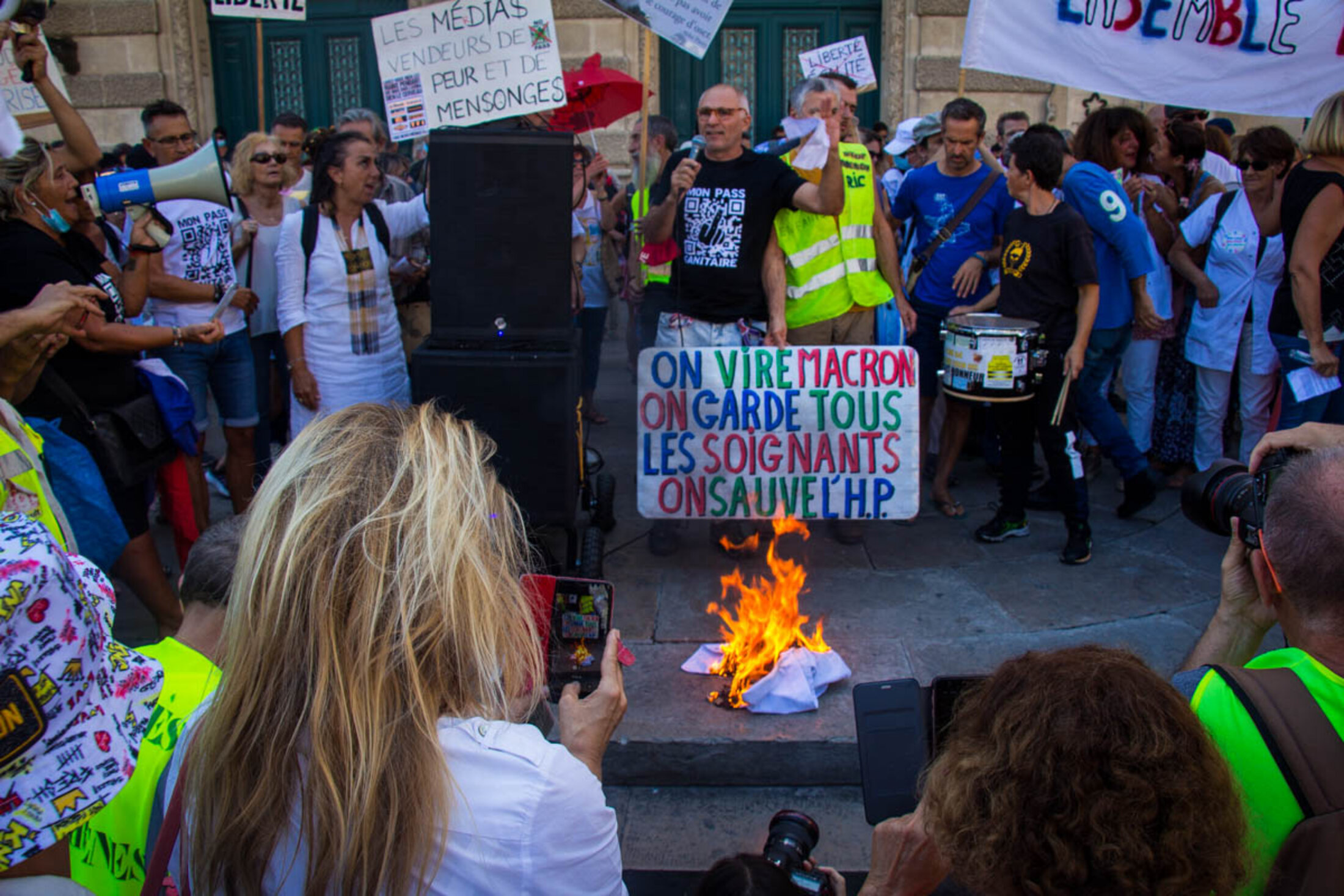 Une fois ces 19 années de bons et loyaux services réduites en un tas de cendres, les organisateurs s’empressent de donner la parole au médecin Denis Agret, figure du mouvement anti-vaccin et très actif sur les réseaux sociaux. Pendant que la blouse blanche fumait sur les marches de l’Opéra Comédie, l’homme tentait d’intimider un journaliste de France 3, en le filmant de très près avec son téléphone, le regard noir, obstruant tant que faire se peut l’angle de vue du caméra-man. “Je m’appelle Denis Agret et je suis médecin. […] Ça fait plus d’un an que je communique pour rétablir une forme de vérité. Il est bien évident qu’on a affaire à un mensonge d’État. Alors vous avez vu, j’ai filmé France 3, qui était juste là, et il a eu peur, il avait honte, parce que depuis des mois, ils déforment nos propos et vos propos. Les médias mainstream sont des collaborateurs majeurs.”
