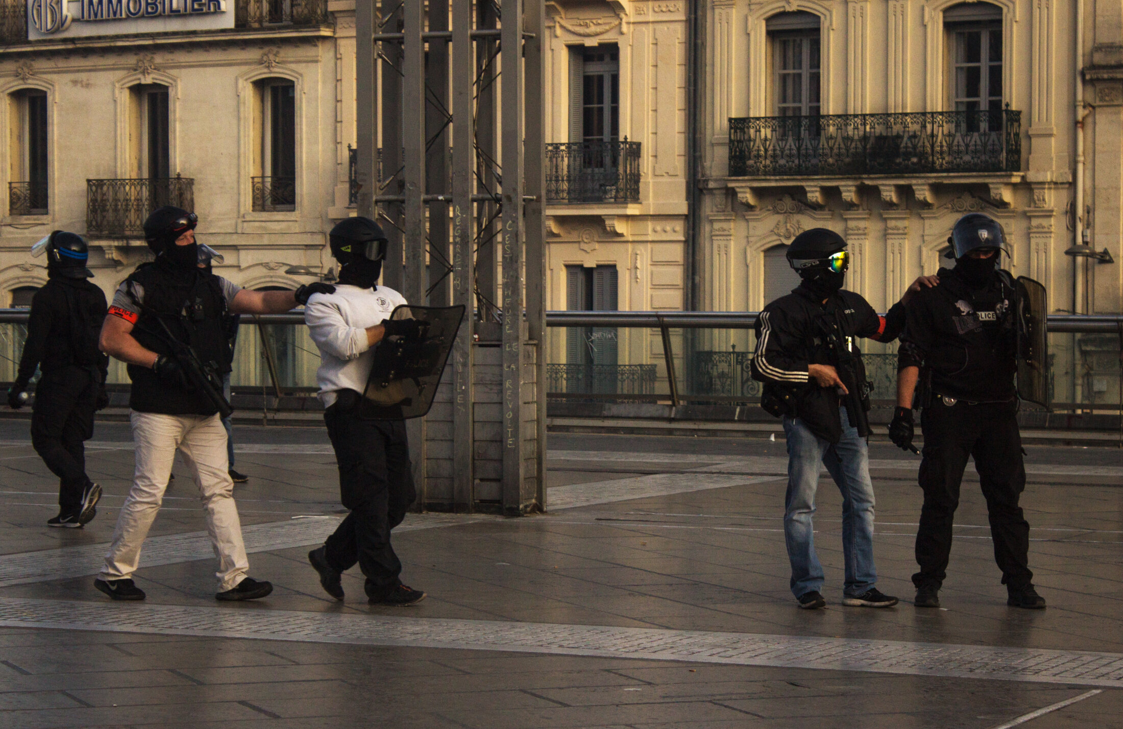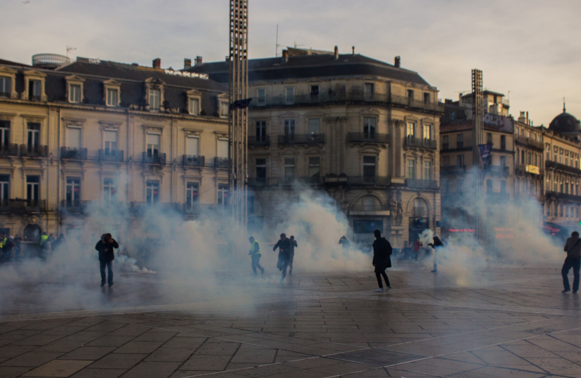 Le plan est désormais bien rôdé. Ceux qui ne résistent pas s'en vont, petit à petit, retourner vers la place de la Comédie avant de se disperser et de rentrer chez eux les yeux rougis, et les autres, toujours plus nombreux chaque semaine, se massent dans la rue Foch pour jouer à chat avec la police et la gendarmerie. Devant le jardin du Peyrou, un jeune homme qui nargue les policiers se fait courser, interpeler dans une charge éclair puis traîner au sol sous les yeux de sa compagne. Les gens résistent, pourtant, font face, avant de s'enfuir sous la pression des gaz. Cette semaine, la moindre présence des black bloc a rendu la tâche plus aisée aux forces de l'ordre. Une manif sauvage complètement désorganisée qui va s'étouffer d'elle même dans des petites rues du centre où les policiers n'hésitent pas à les segmenter et nasser violemment. Pourtant, même séparés, les manifestants parviennent à se retrouver sur la place de la Comédie, mêlés aux flâneurs habituels de ces samedis après midis ensoleillés dans le centre ville, qui font des yeux écarquillés devant l'étrange scène qui se produit. Un escadron de la BAC avance en pointant leurs armes vers la foule qui mélange badauds et gilets jaunes. C'est la panique, tout le monde se met à courir. Du gaz est envoyé, des lignes de CRS avancent, la manif sauvage s'enfuit, poursuivie par les gaz et les hommes en bleu.
