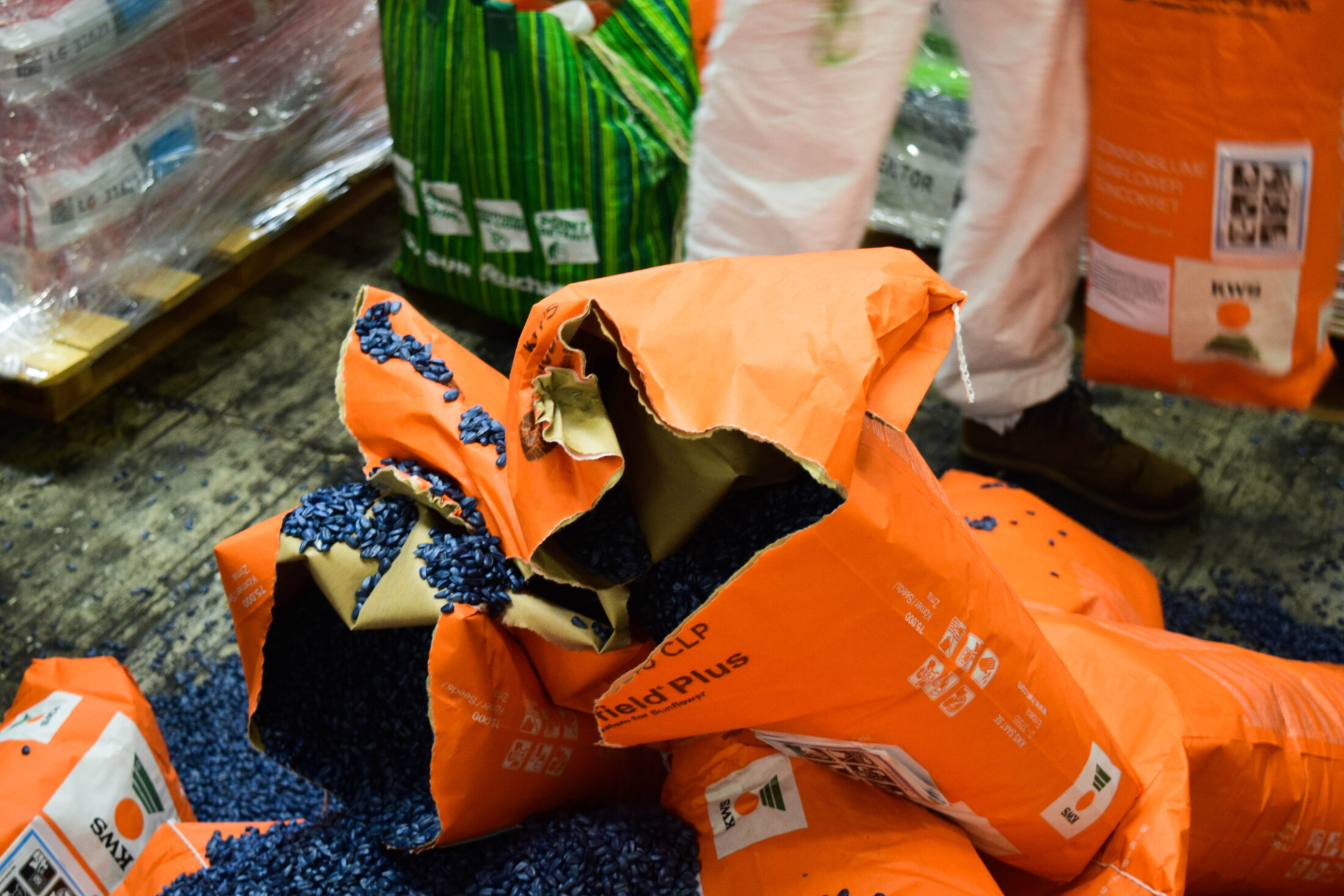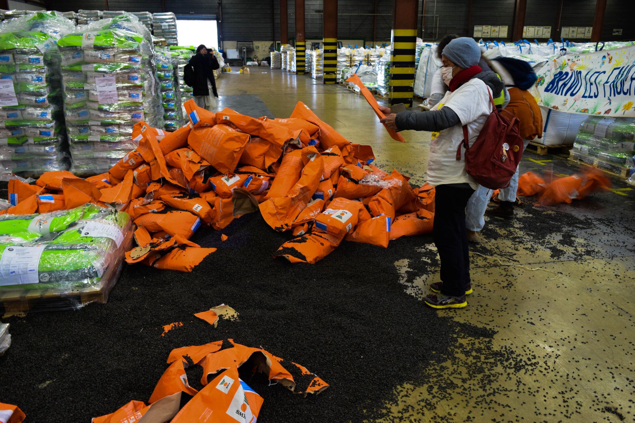 Les faucheurs·ses, déjà affublé·es de leurs tuniques blanches et prêt·es à dégainer les masques qui les protègeront non pas du coronavirus, mais des pesticides qui enrobent certaines semences, se réunissent et pénètrent l’immense hangar sous le regard presque amusé de certains employés : « Y’a que du bio ici ! » plaisante l’un d’eux, qui ne se doute pas de ce qui est à venir. Les numéros de série des variétés incriminées ont été préalablement repérés. Bien vite, les faucheurs et faucheuses se faufilent parmi les milliers de palettes contenant chacune des dizaines de lourds sacs de semences, et repèrent les fameux VrTH de Colza ou de Tournesol. Par petits groupes de trois ou quatre, ils et elles rompent les films plastiques entourant les palettes et se mettent à éventrer les sacs et les vider au sol, sous le regard estomaqué des employés. Certains interviennent pour tenter de faire cesser le saccage : « Appelez la gendarmerie » lance, laconique, un faucheur de la première heure. Ils ne se feront pas prier.